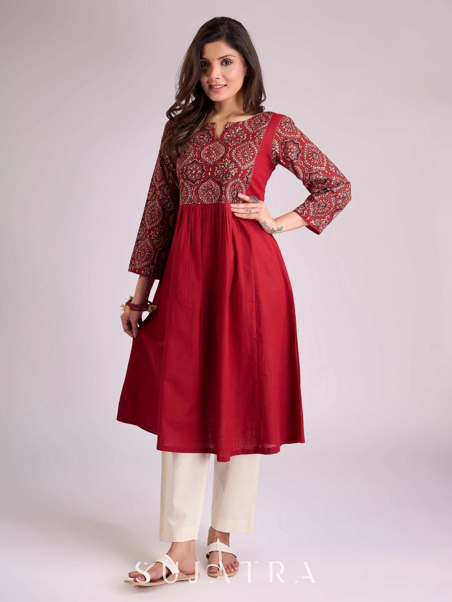 Graceful Gathered Maroon Cotton Kurta with Ajrakh Yoke, Sleeves & Intricate Kantha Handwork