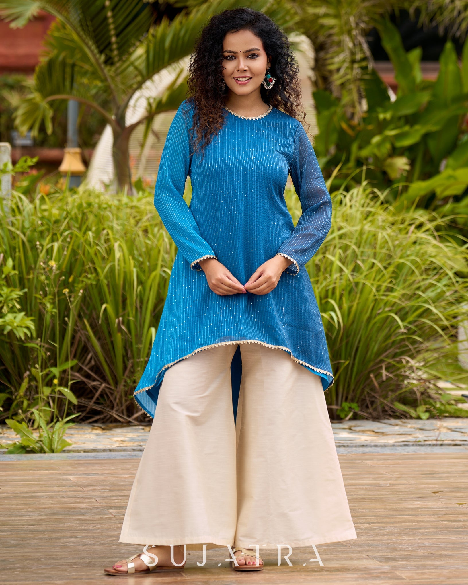Elegant Blue Ombre Embroidered High-Low Statement Short Kurta - Flared Pants Additional