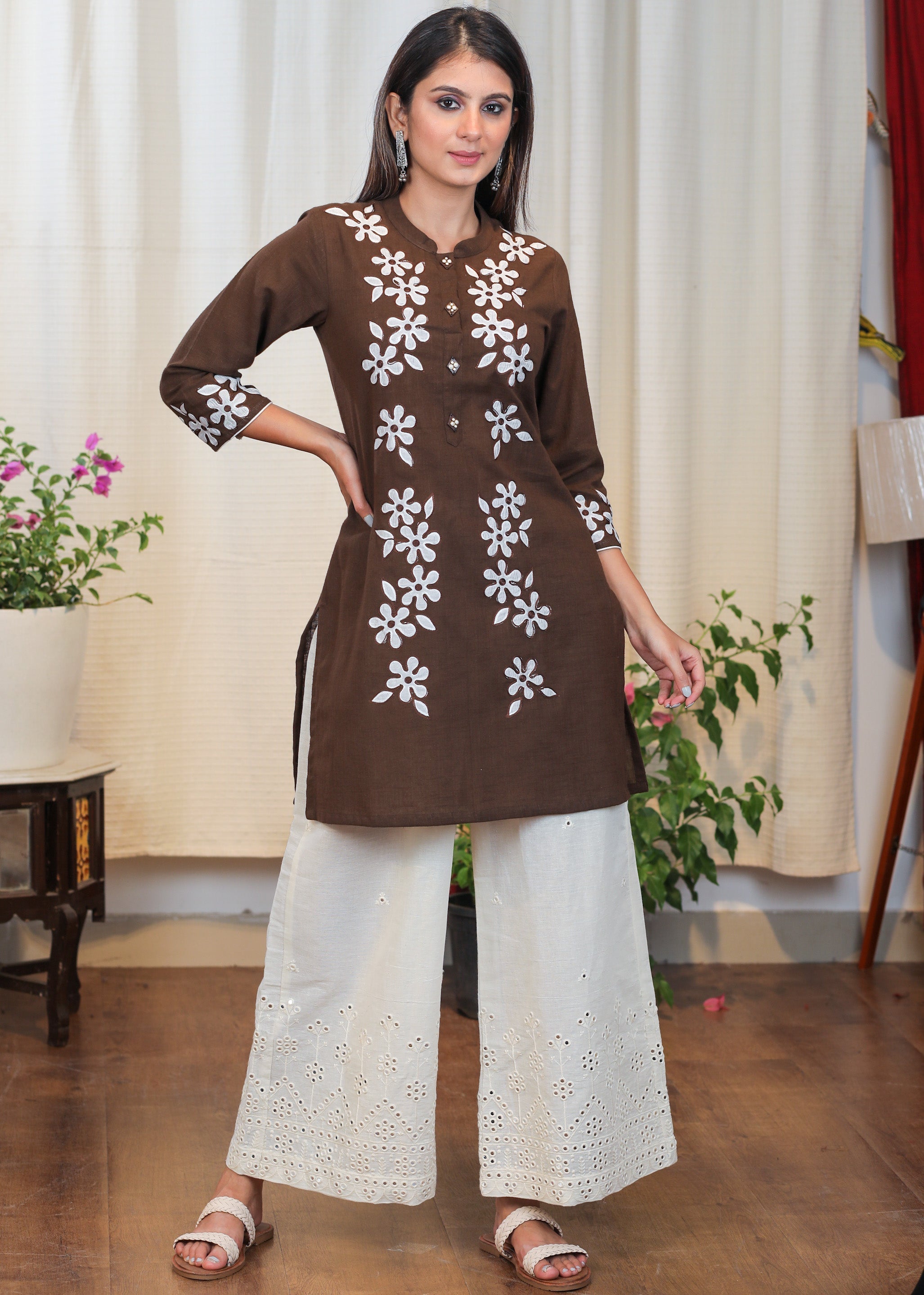 Graceful Coffee Brown Cotton Tunic with Beautiful full length Aaplic work