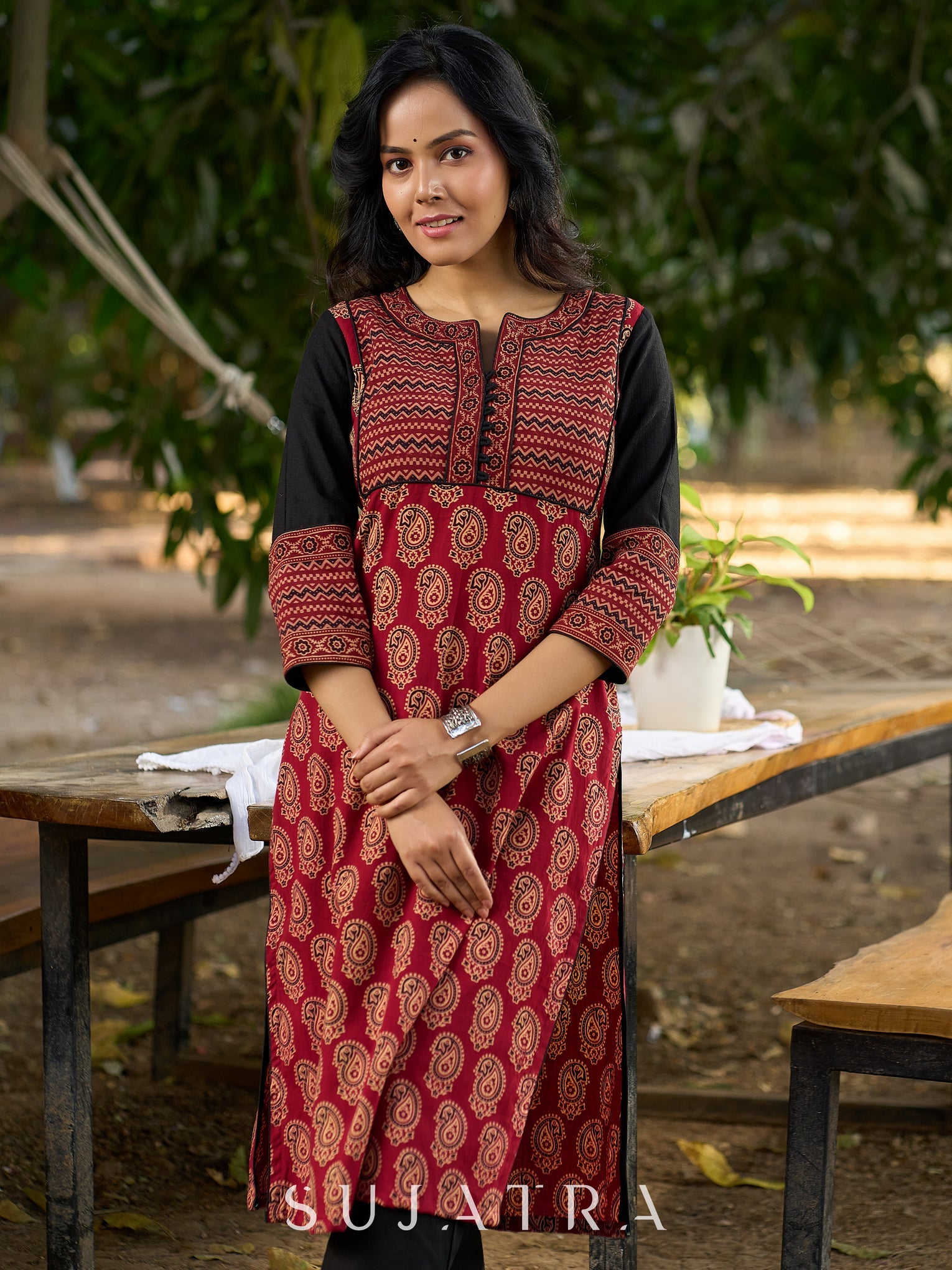Ajrakh Printed Cotton Kurta with Contrasting Black Sleeves