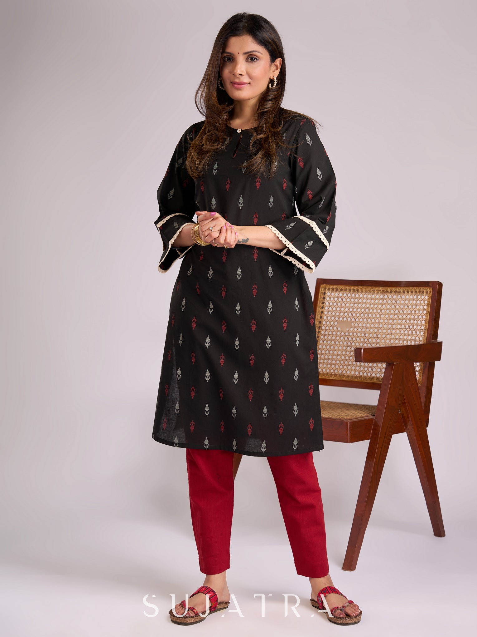 Beautiful Black Printed Cotton Kurta with Delicate Crochet Lace Detailing