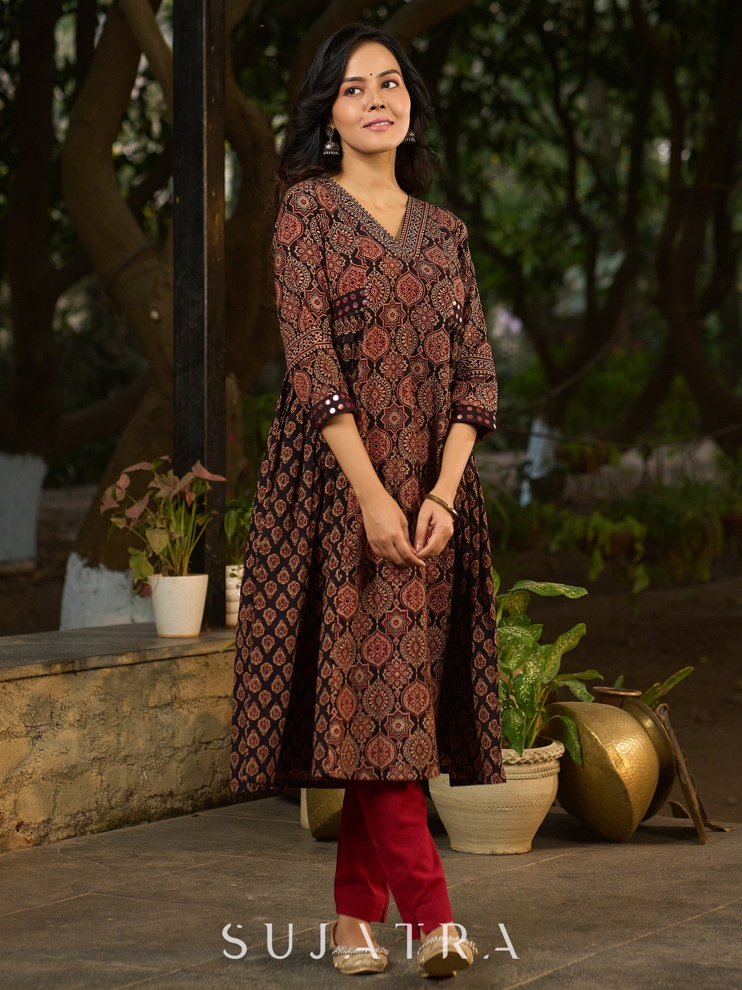 Black Ajrakh Kurta Adorned with Side Gathers and Delicate Mirror Highlights
