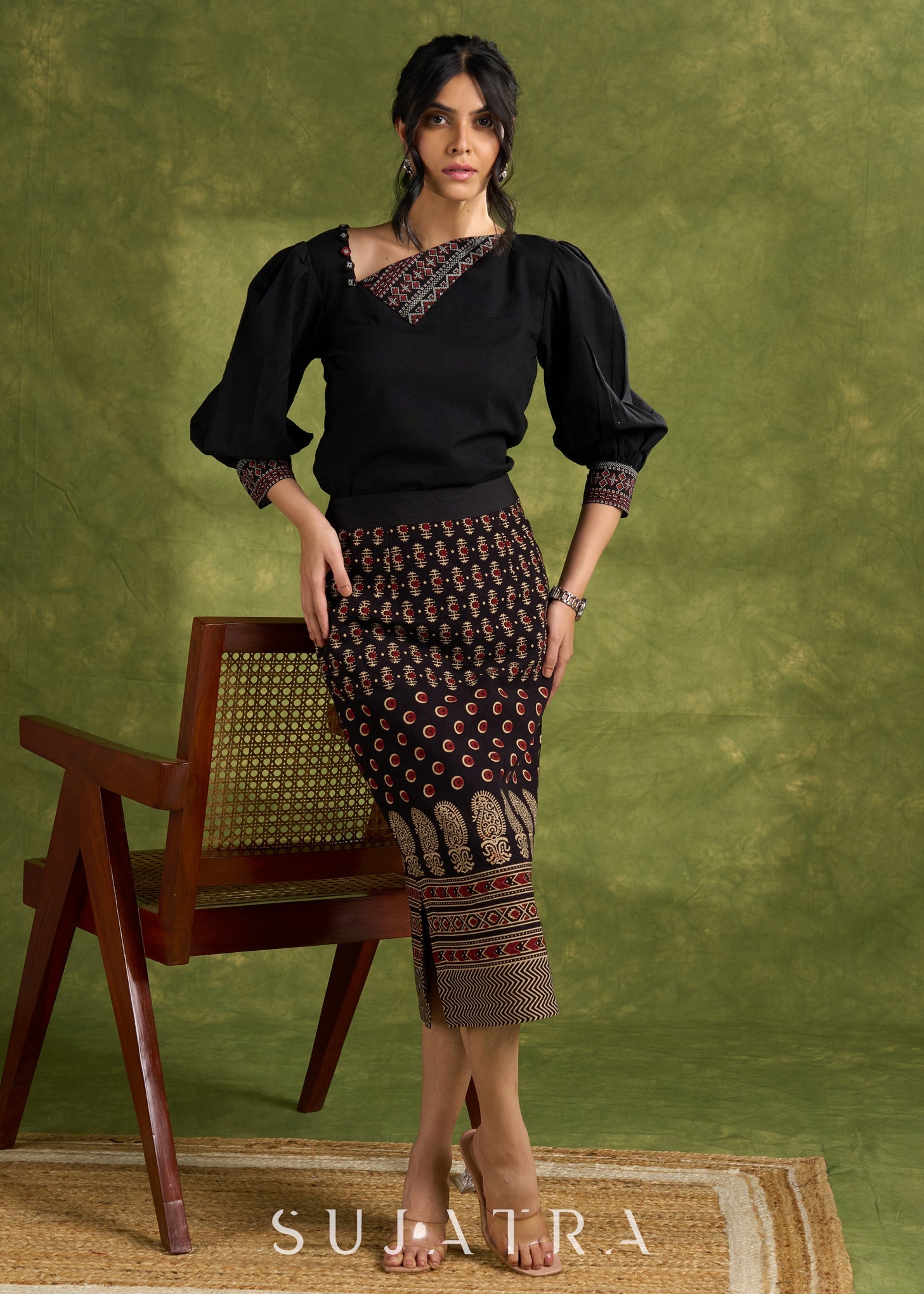 Black Cotton Top With Asymmetric Neck And Puffed Sleeves - Skirt Optional