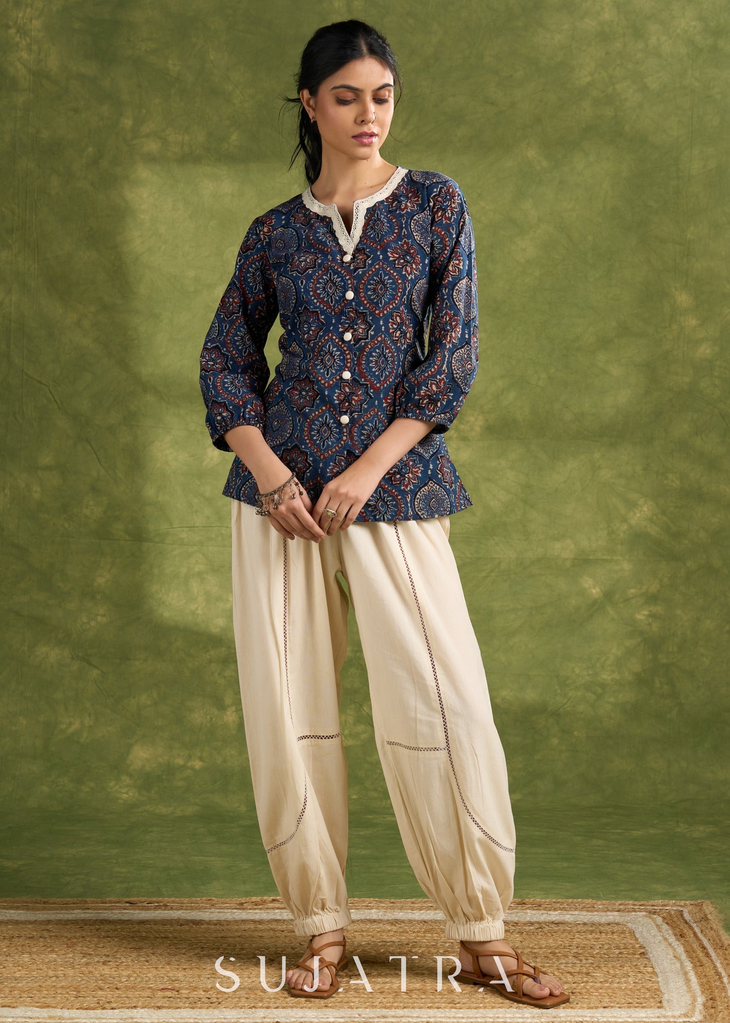 Blue Ajrakh Hand Blocked Cotton Top With Laces - Pant Optional