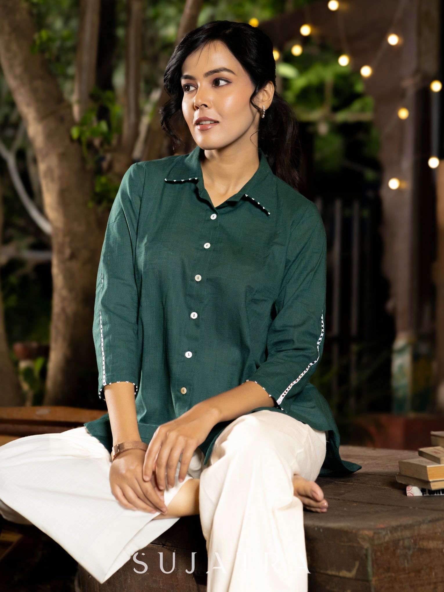 Bottle Green Cotton Shirt with Delicate White Lace and Bead Embellishments
