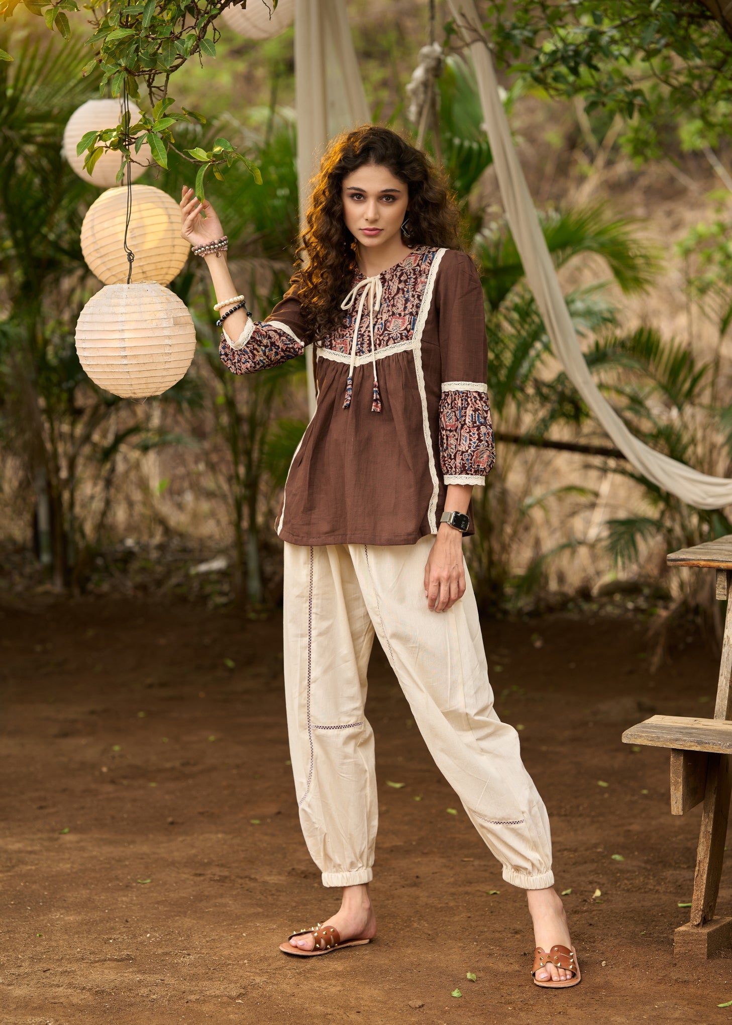 Brown kalamkari top with beautiful lacework - Pant Optional