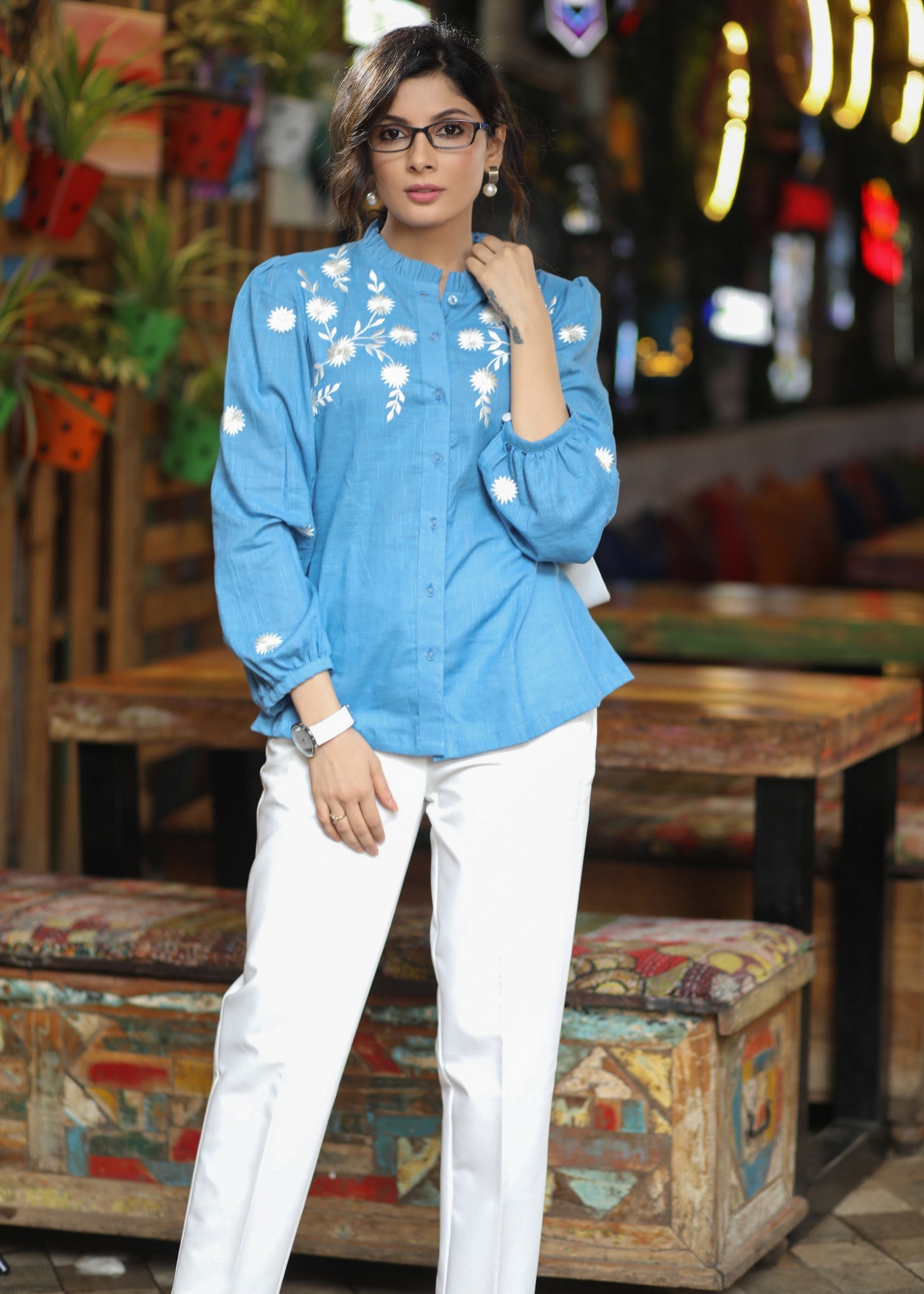 Casual Powder Blue Cotton Shirt with Beautiful Floral Embroidery