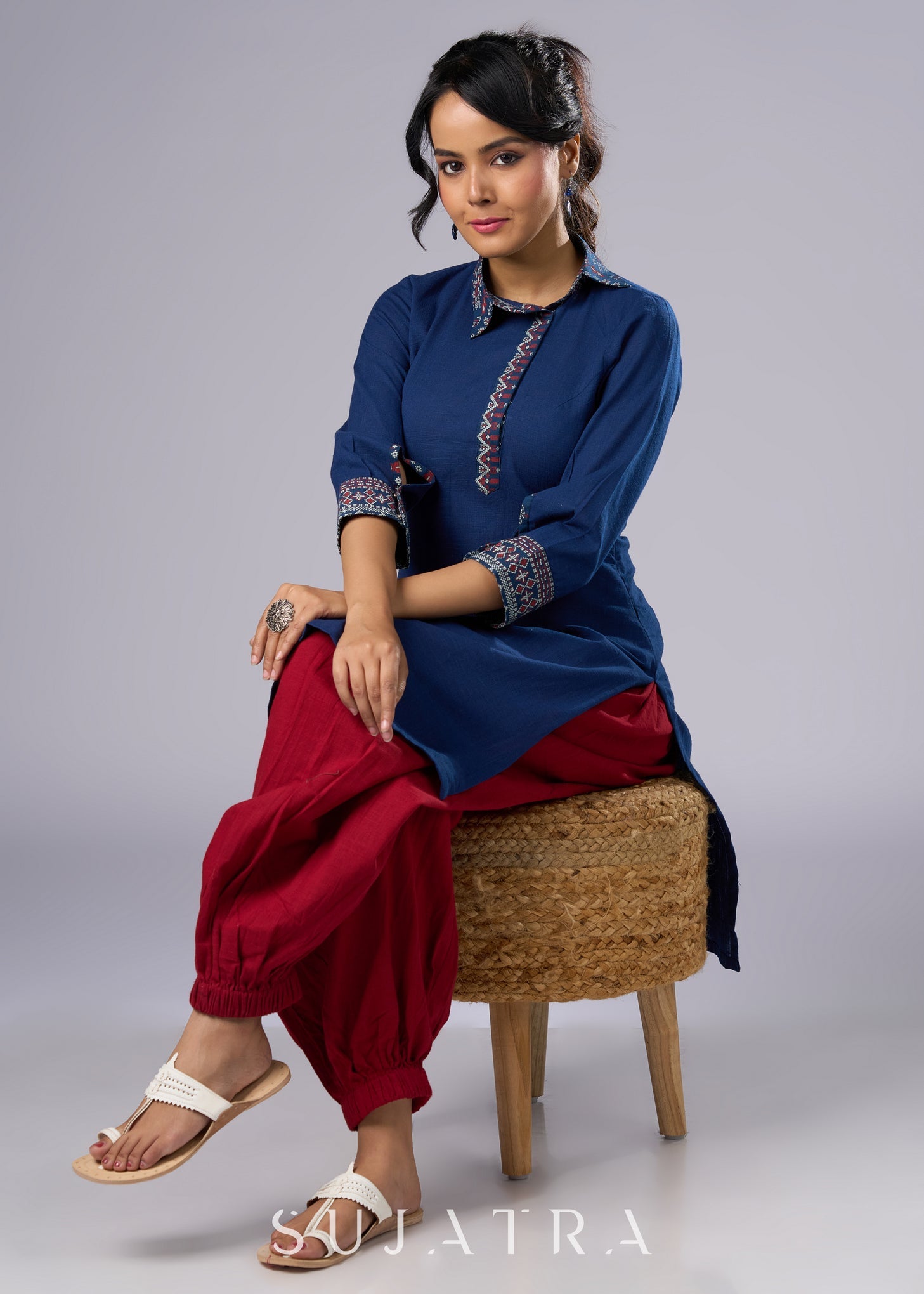Classic Navy Blue Cotton Tunic with Stylish Collar - Pant Additional