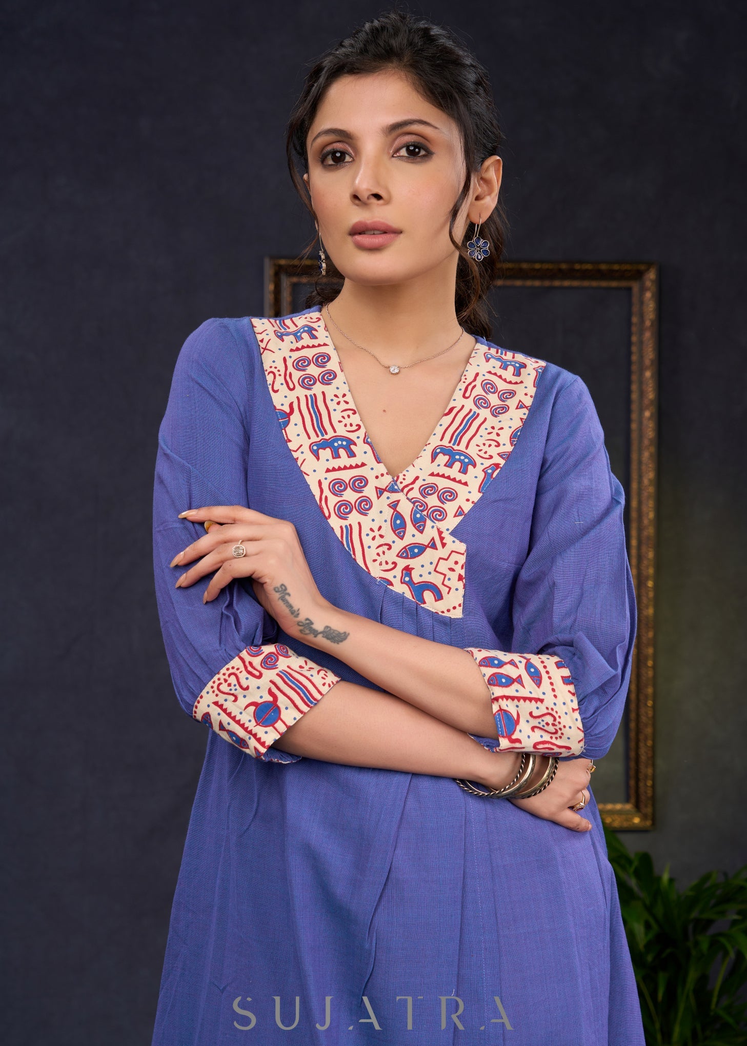 Classy-Blue-Cotton-A-Line-Kurta-Highlighted-With-Beautiful-Ajrakh-Print--Pant-Optional