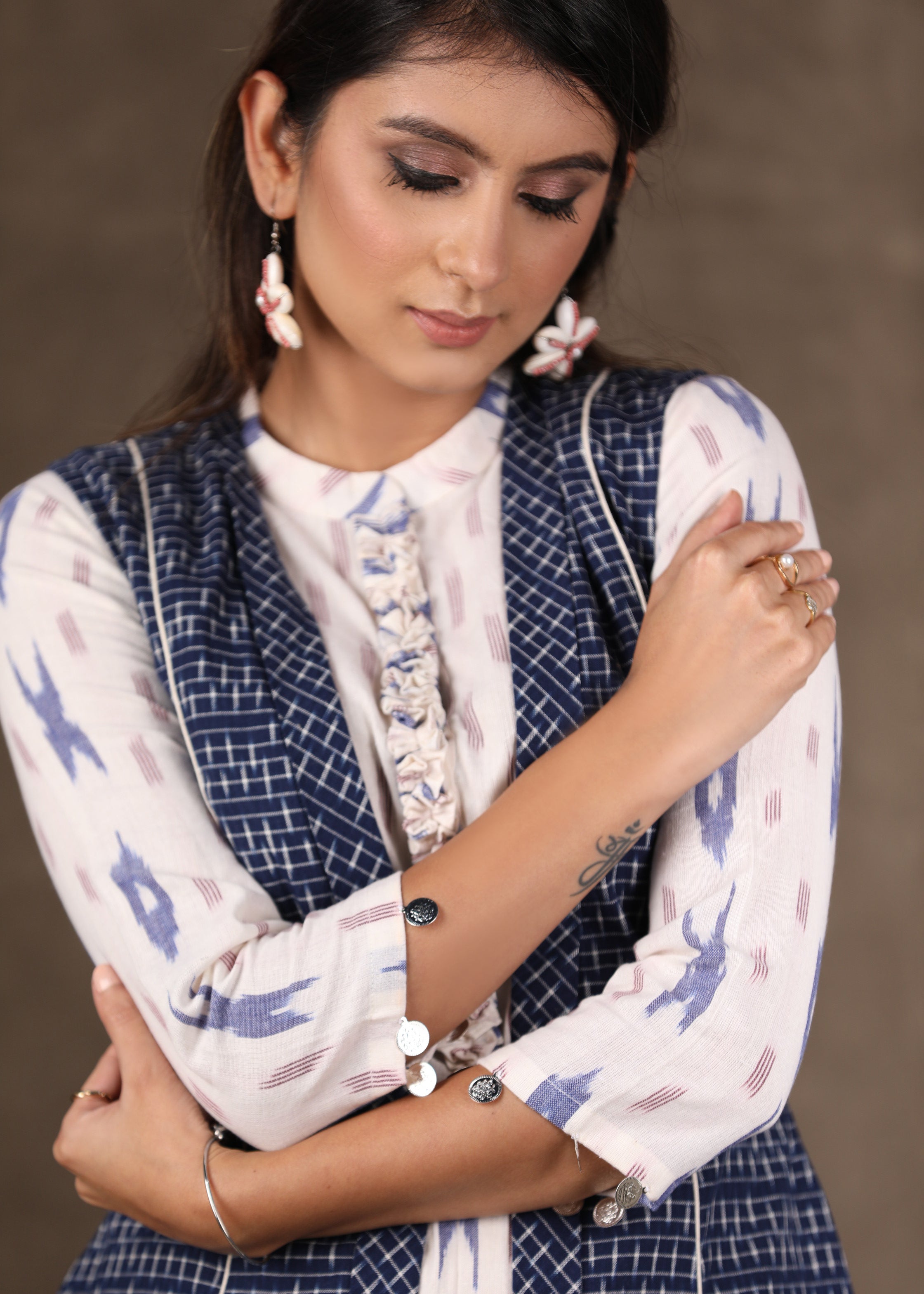 Classy Cotton Ikat A Line Kurta with Navy Blue Ikat Shrug - 2 Piece (Pant Additional)