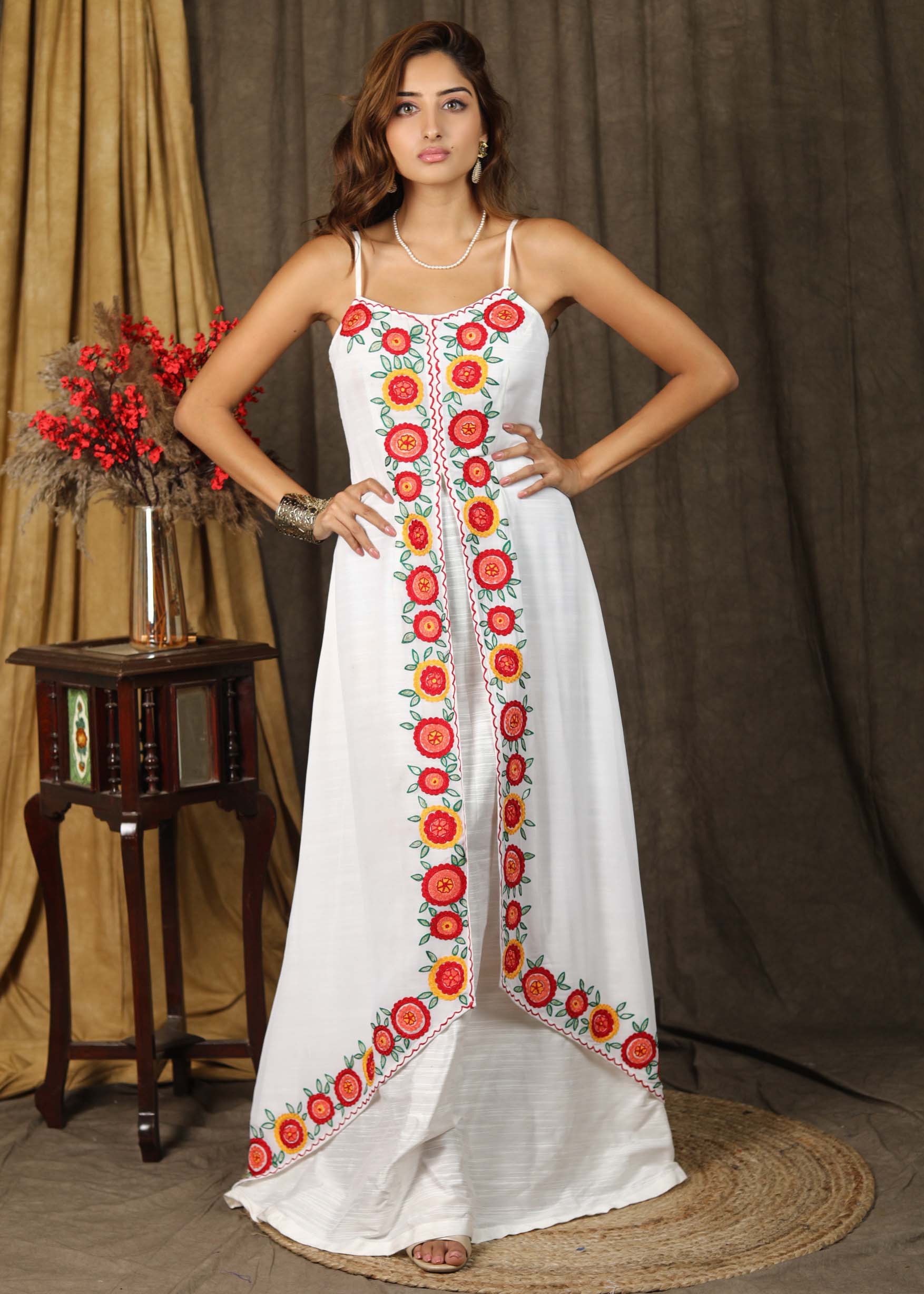 Classy white boho inspired strappy maxi dress with floral embroidery on front layer with optional georgette shrug