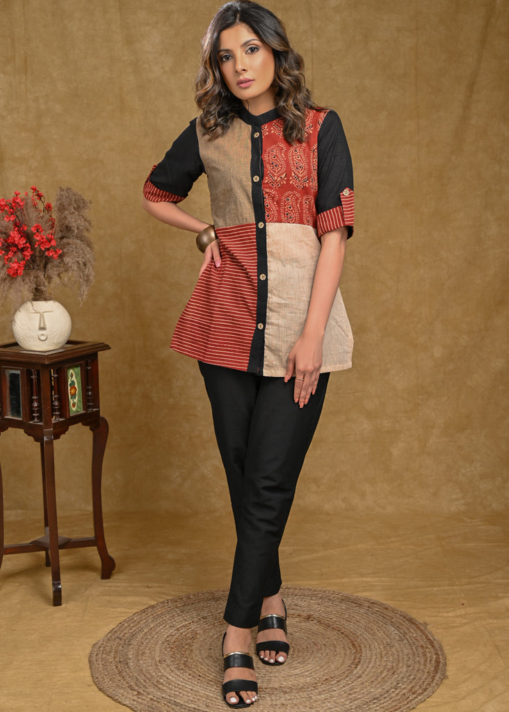 Cotton Ajrakh Top with Ambi Ajrakh and Stipes Ajrakh Combination