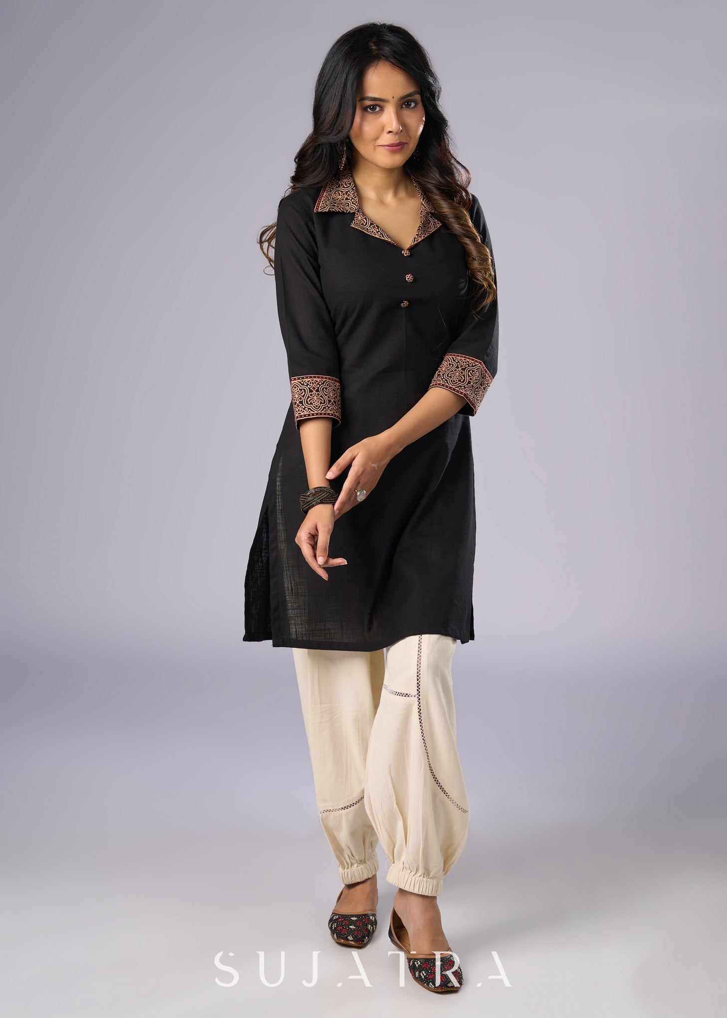 Elegant Black Cotton Ajrakh Collared Tunic Pant Additional