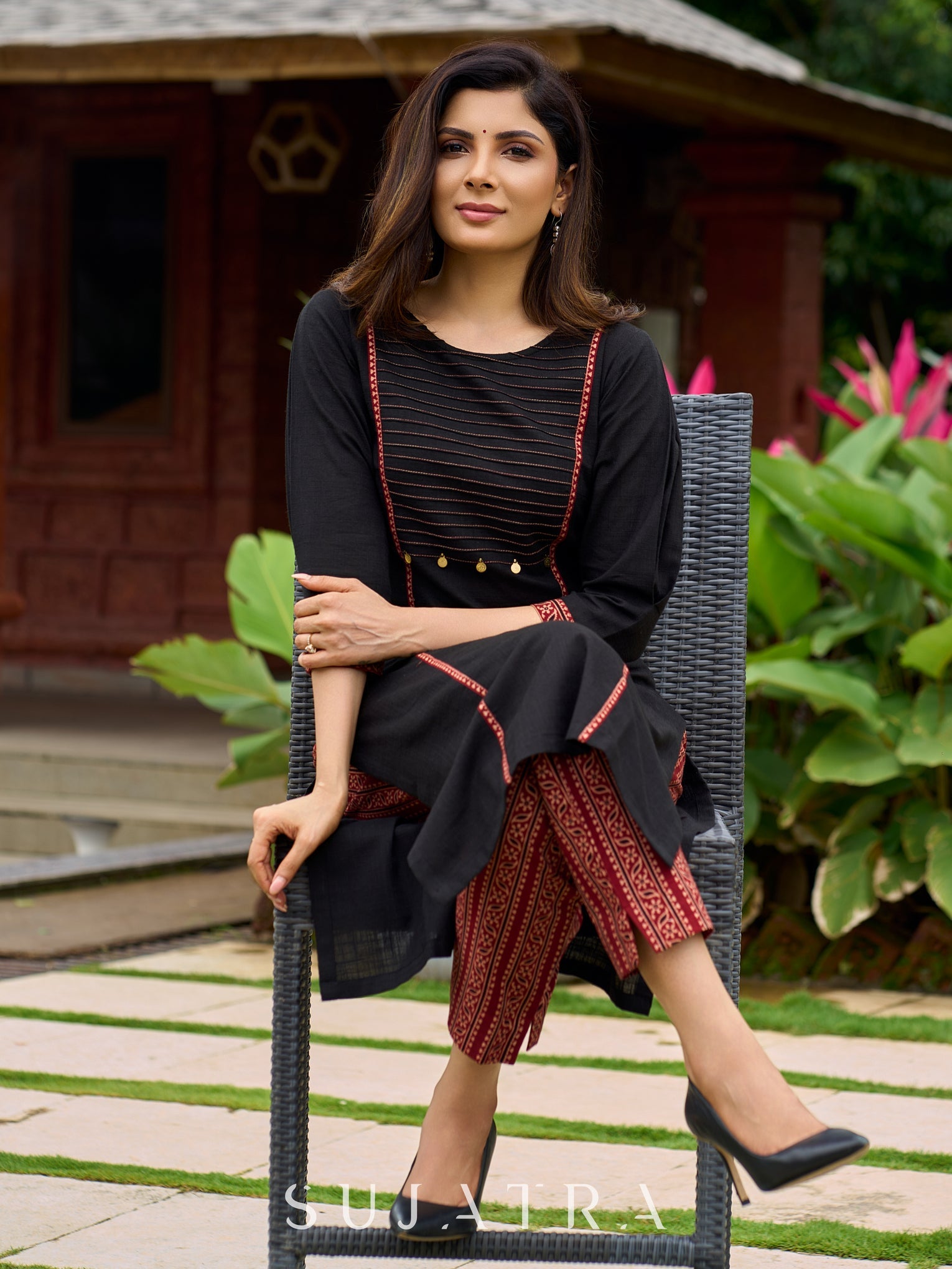 Elegant black cotton pintuck kurta adorned with Ajrak border - ajrak pant optional