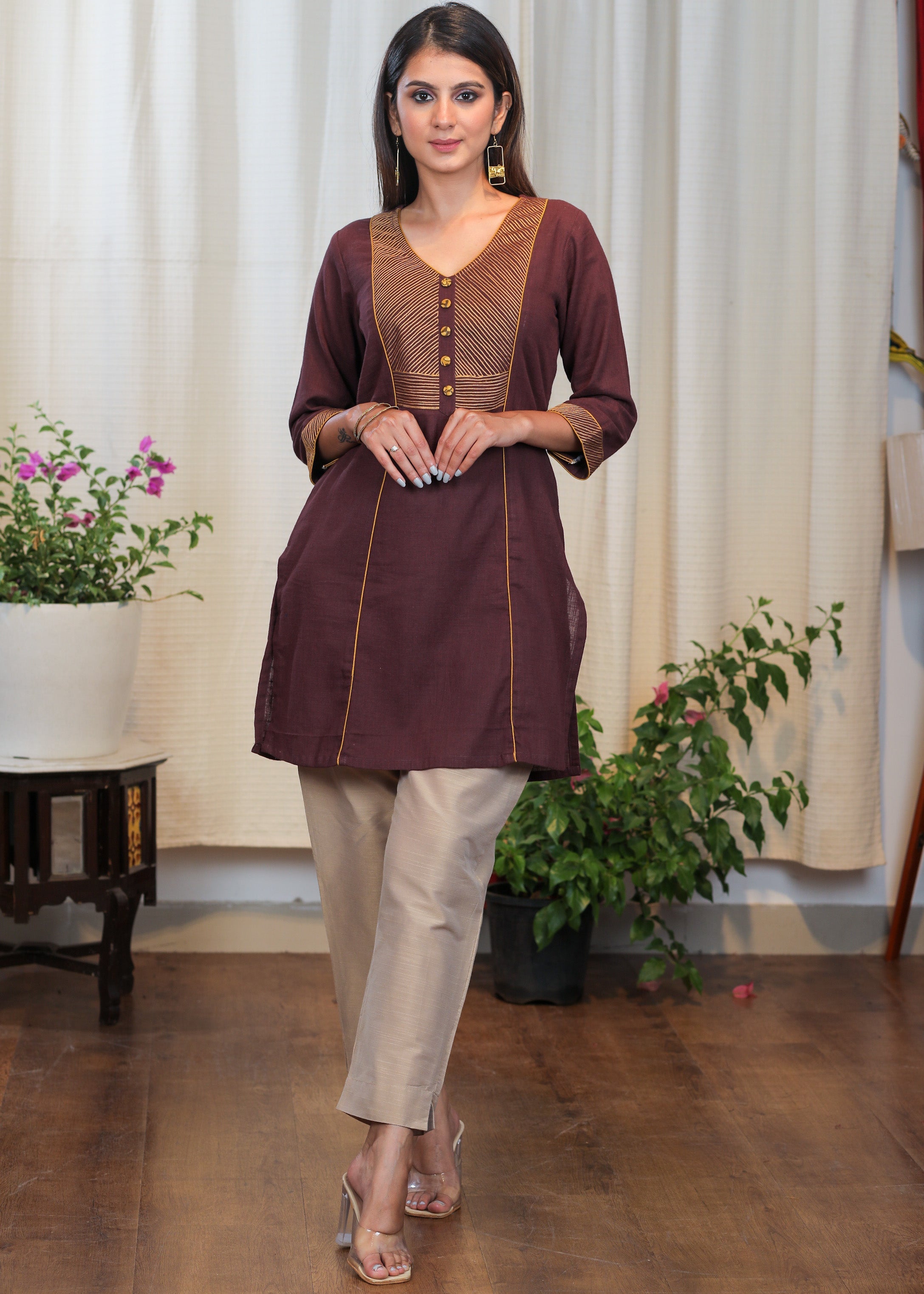 Elegant Coffee Brown Tunic With Beautifully Embroidered Yoke and Buttons