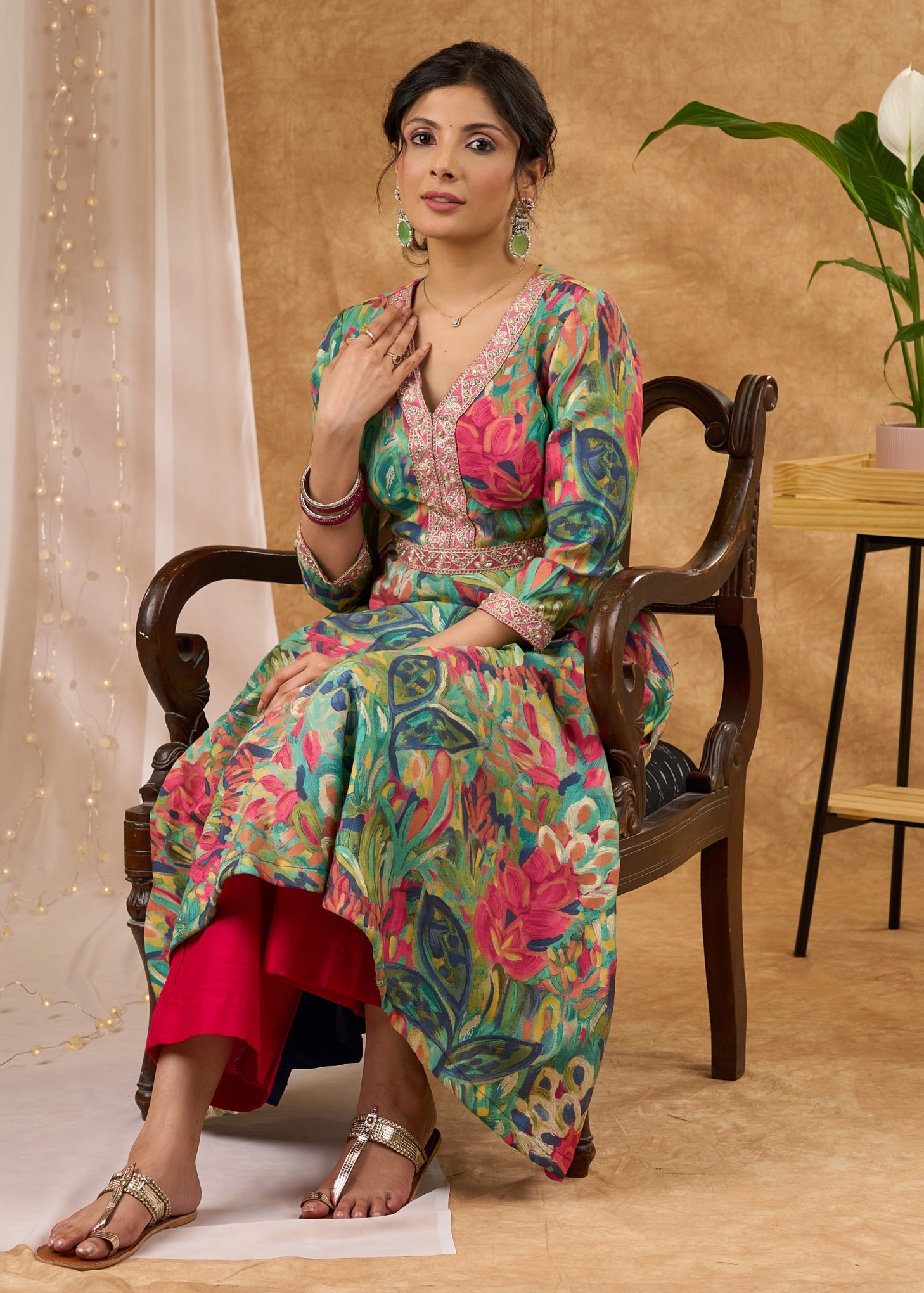 Embroidered flared printed kurta with beautiful detailing Pant optional