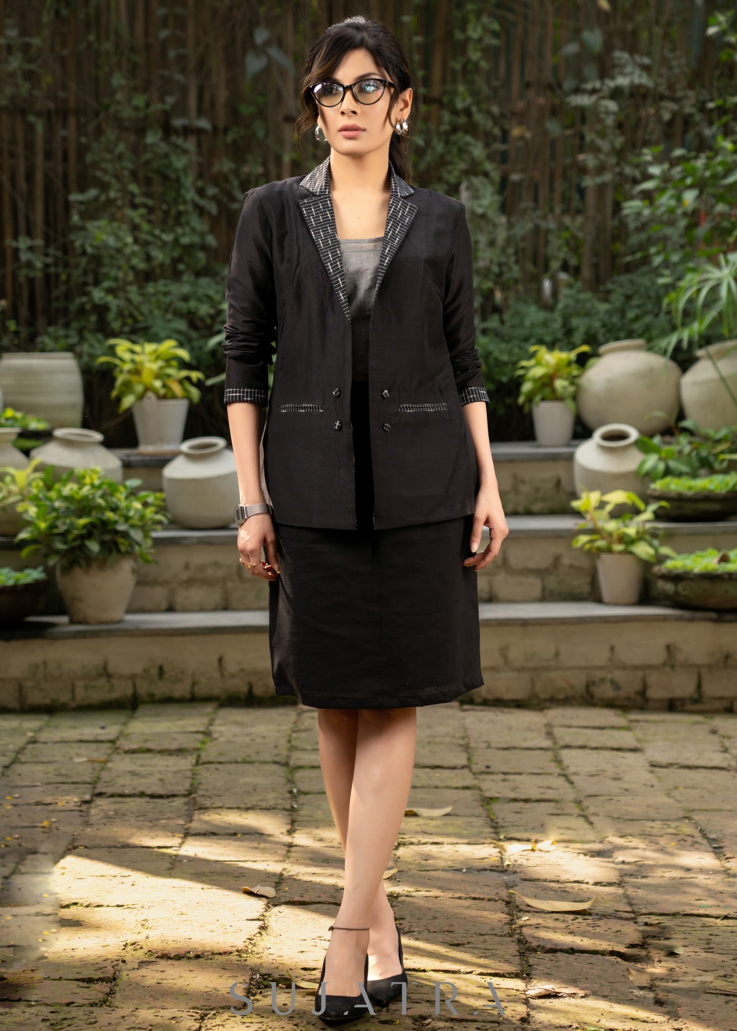 Exclusive black cotton silk formal blazer with ikat combination and optional cotton skirt