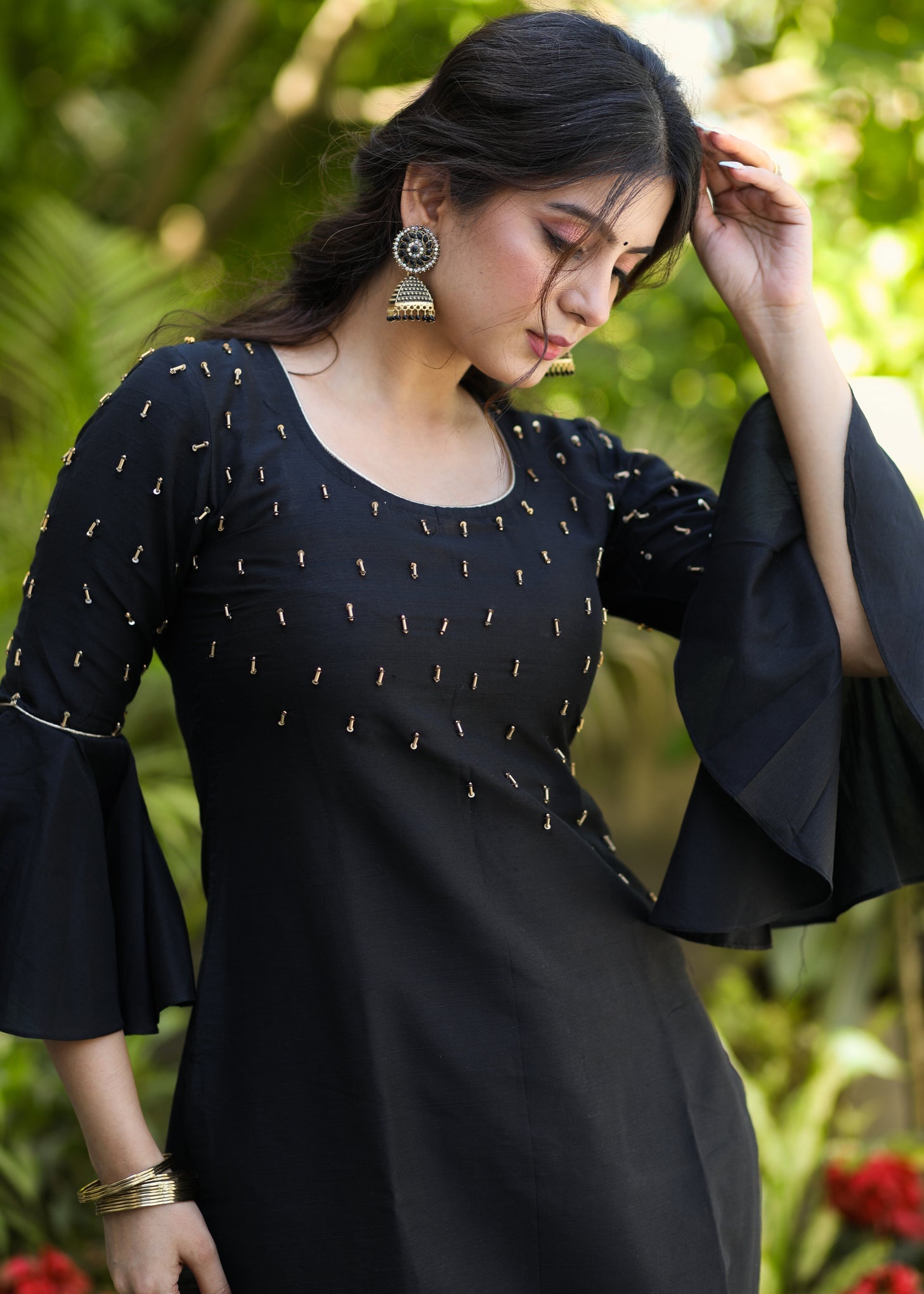 Exclusive Black Cotton Silk Hand Embroidered Peplum Sleeve Kurti - Pant Optional