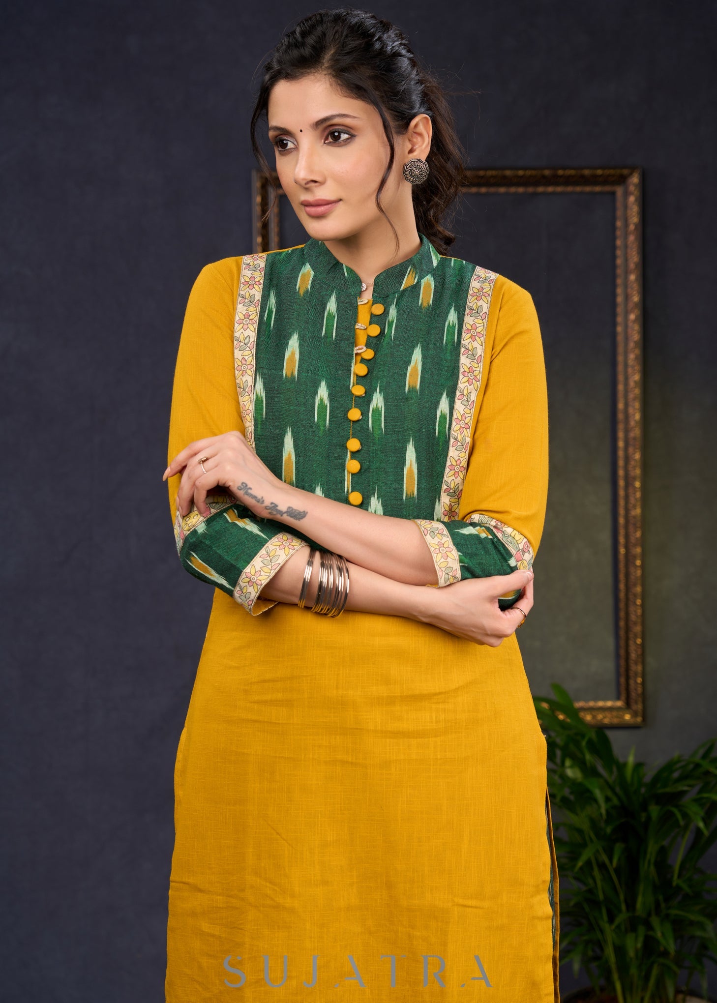 Exclusive-Mustard-Cotton-Straight-Cut-Kurta-With-Ikat-Combination-Yoke-&-Madhubani-Highlights--Pant-Optional