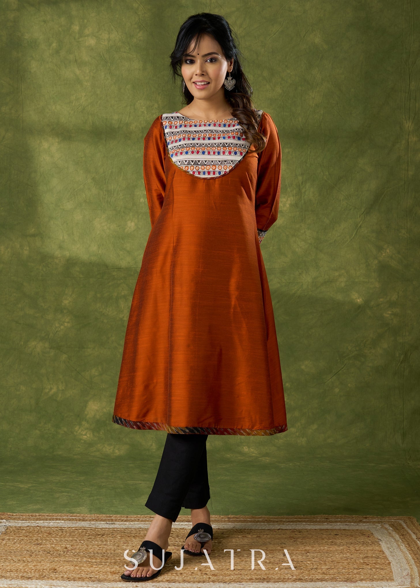 Exclusive Rust Kurta With Hand Painted Madhubani Yoke - Pant Optional