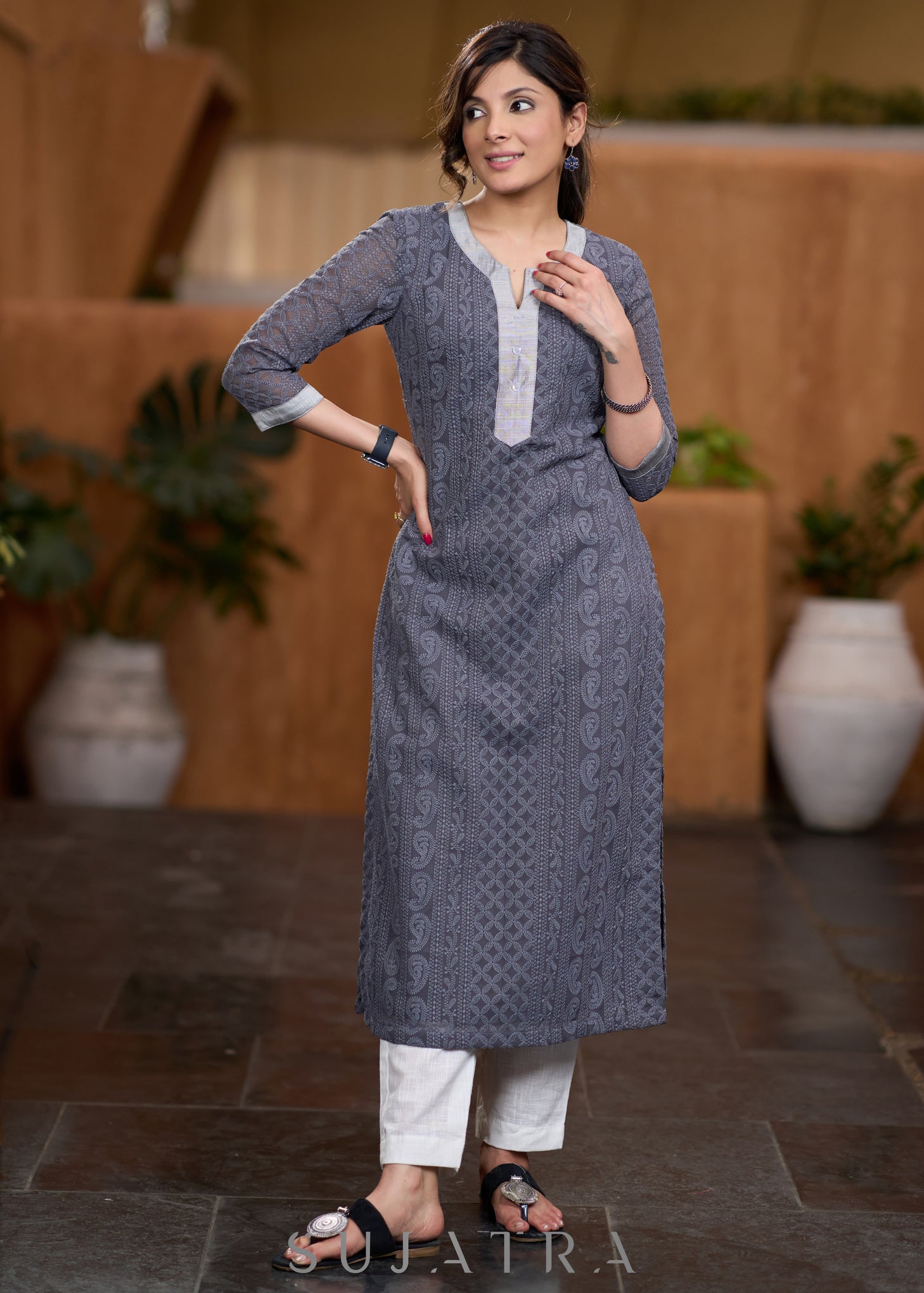 Flowy Grey chikankari kurta with contrast detaling Pant optional