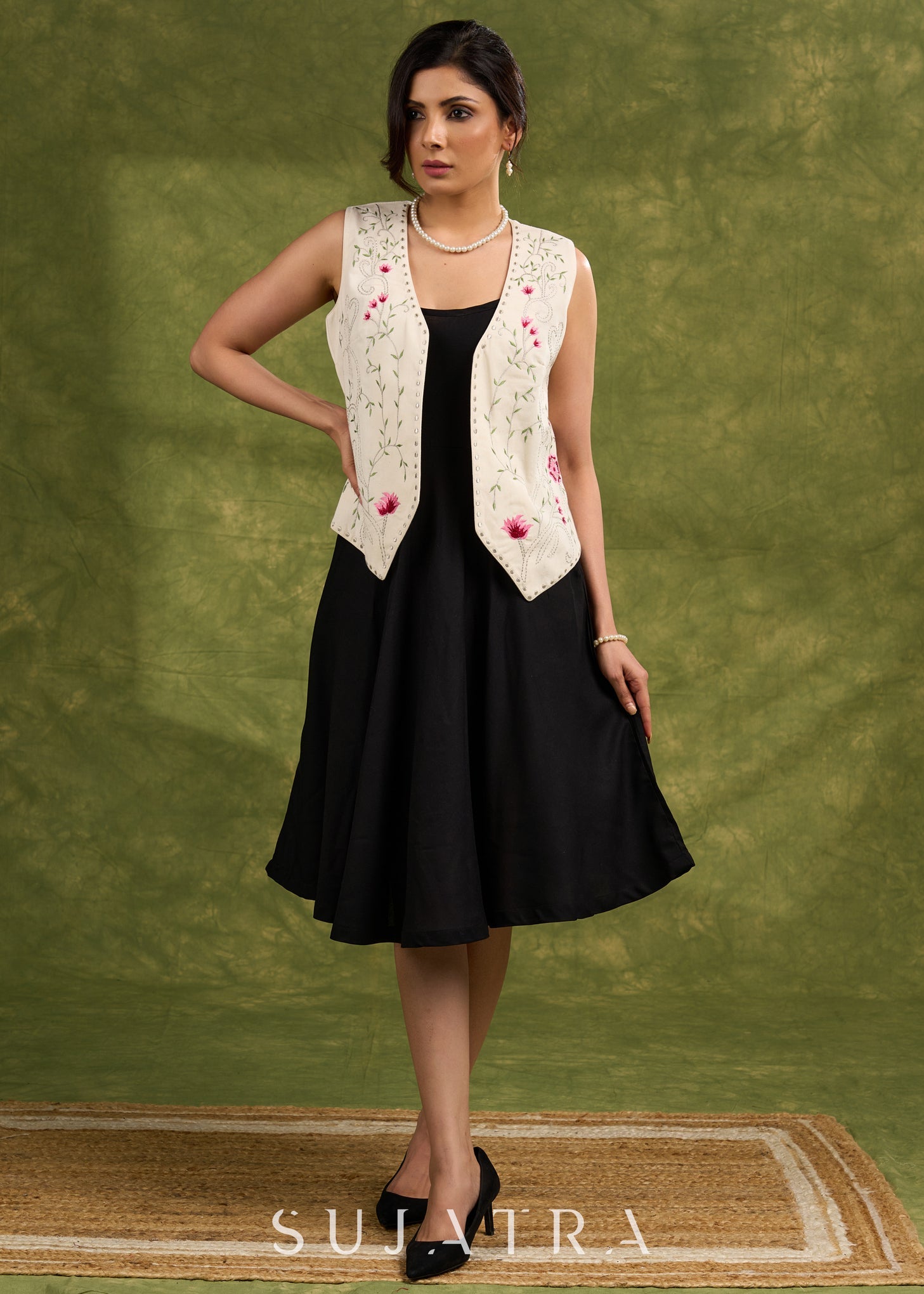 Garden Party Elegance : Off White Floral Embroidered Waist Coat Dress Optional