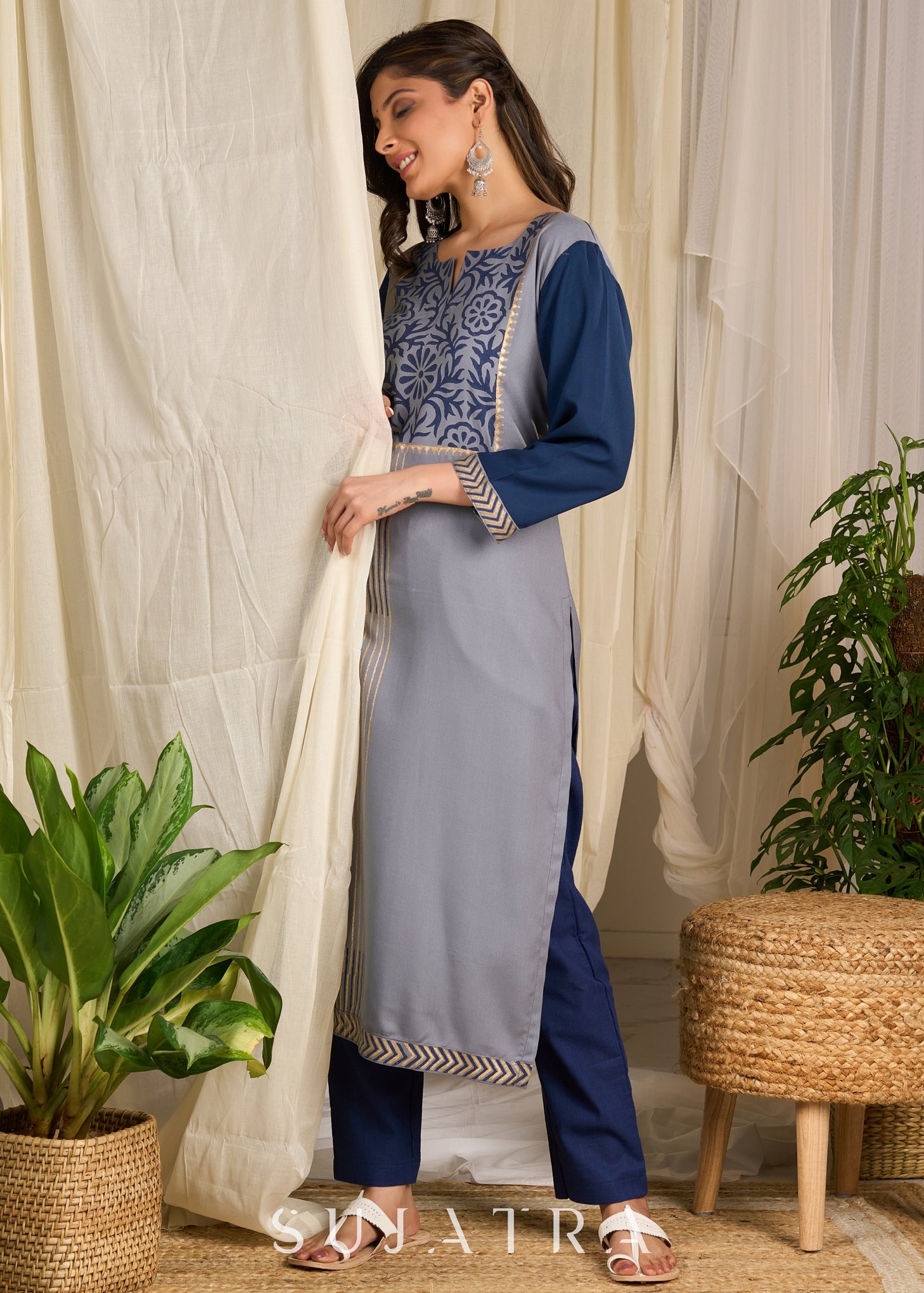 Graceful grey rayon kurti adorned with intricate block prints and artisanal floral patterns