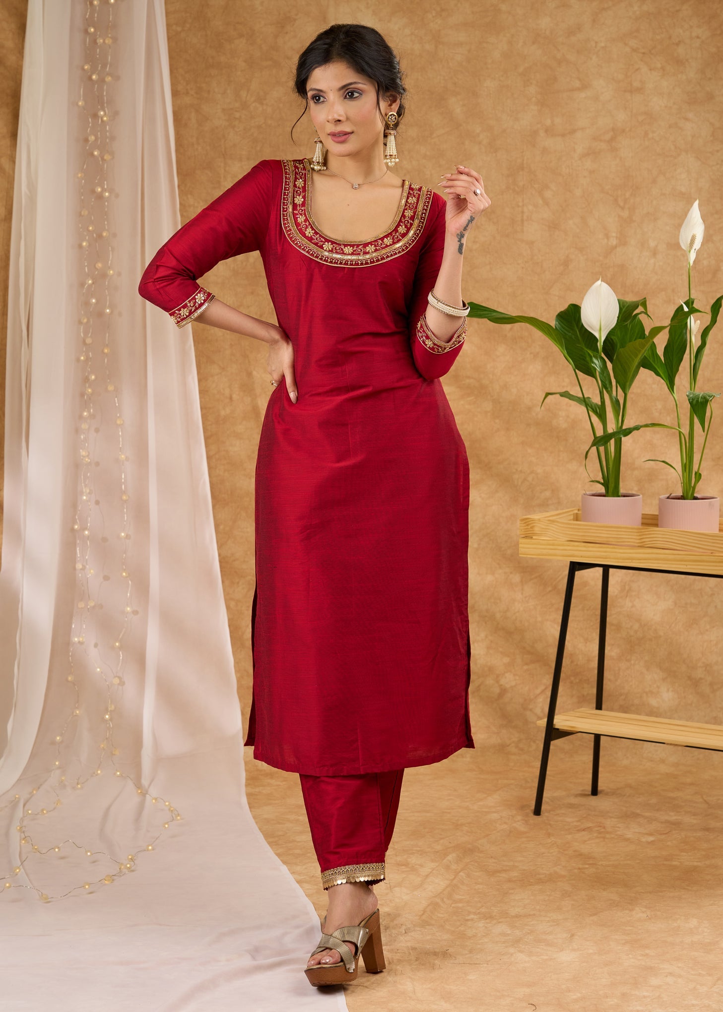 Graceful hand embroidered maroon cotton silk kurta Pant Optional