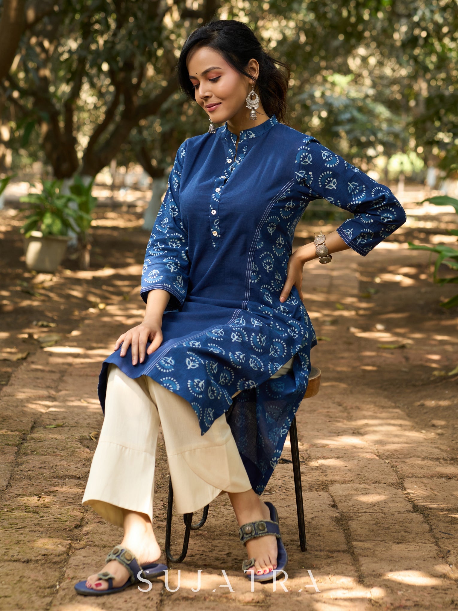 Indigo Allure Straight Kurta with Side Panels & Sleeves Adorned with Delicate Kantha Stitch detailing on Princess Line and Sleeves