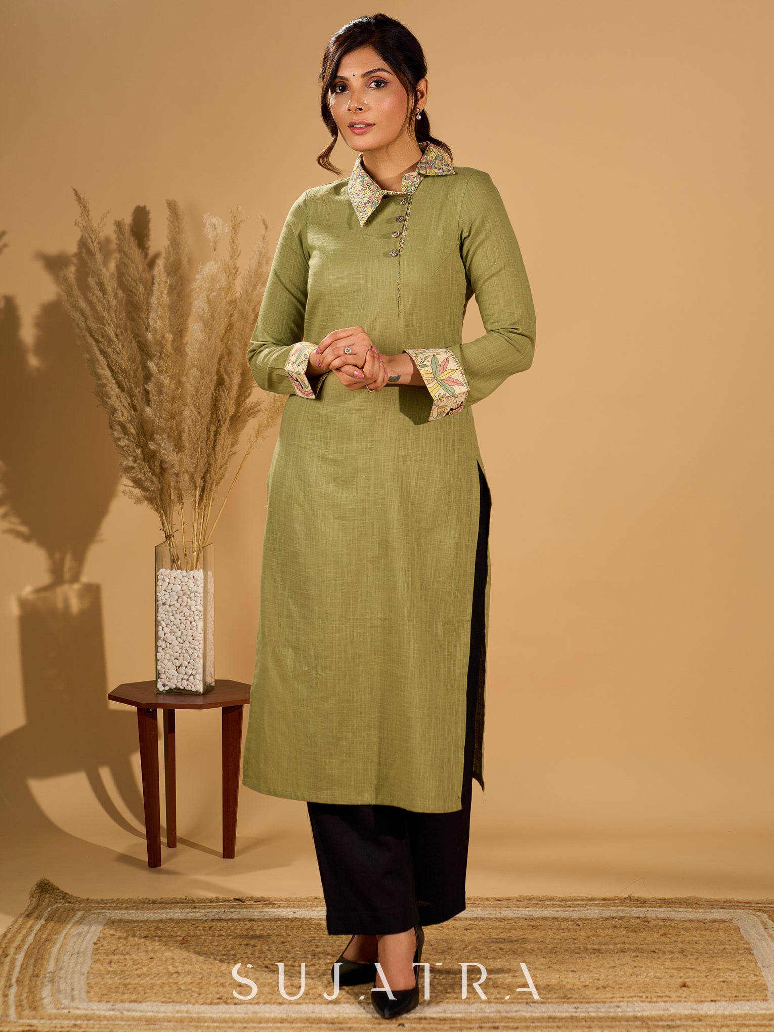 Meadow Mint Slub Kurta with Artistic Cuffs and Twisted Collar