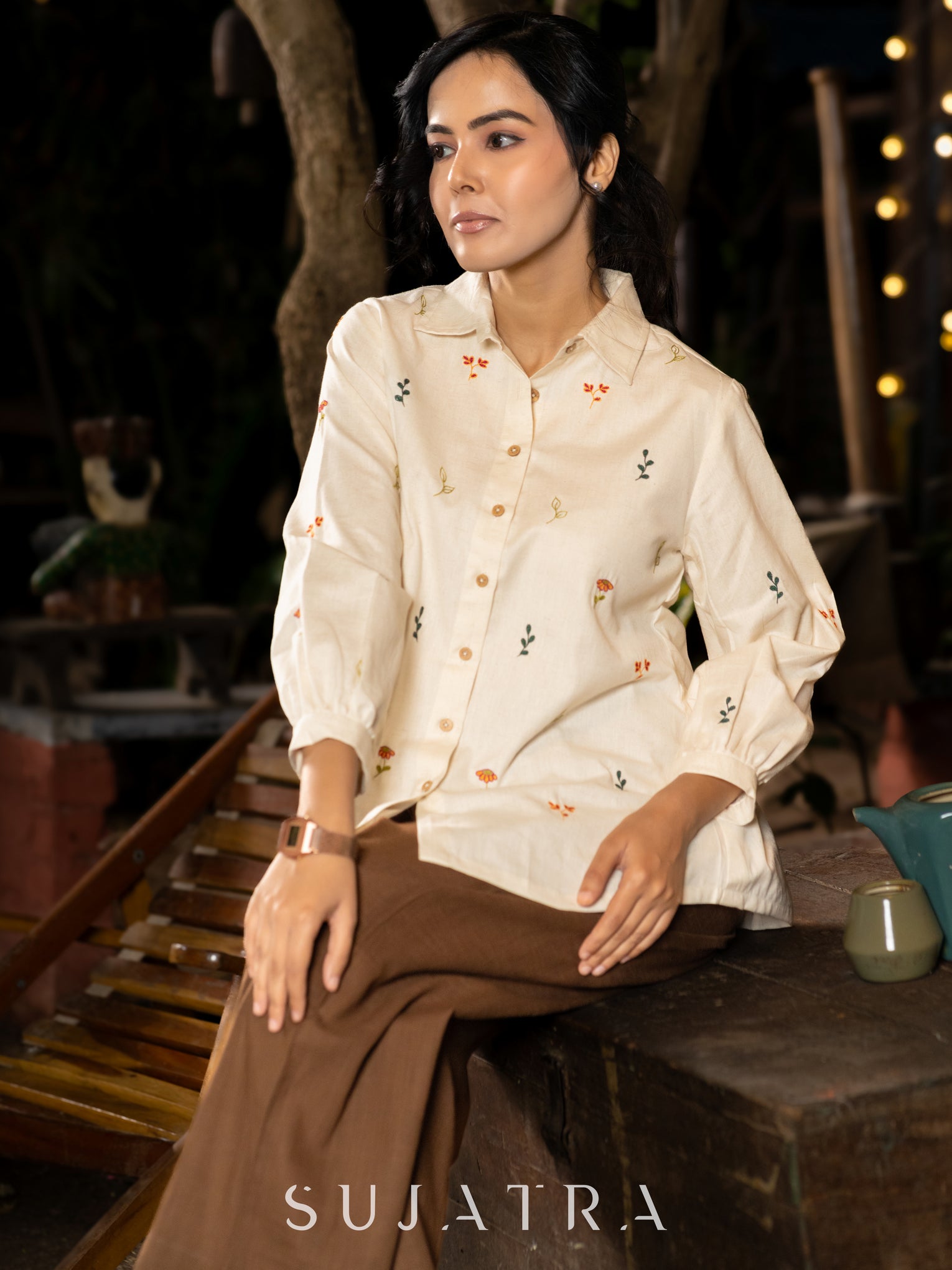Off-White Cotton Shirt with Exquisite Handcrafted Floral Embroidery