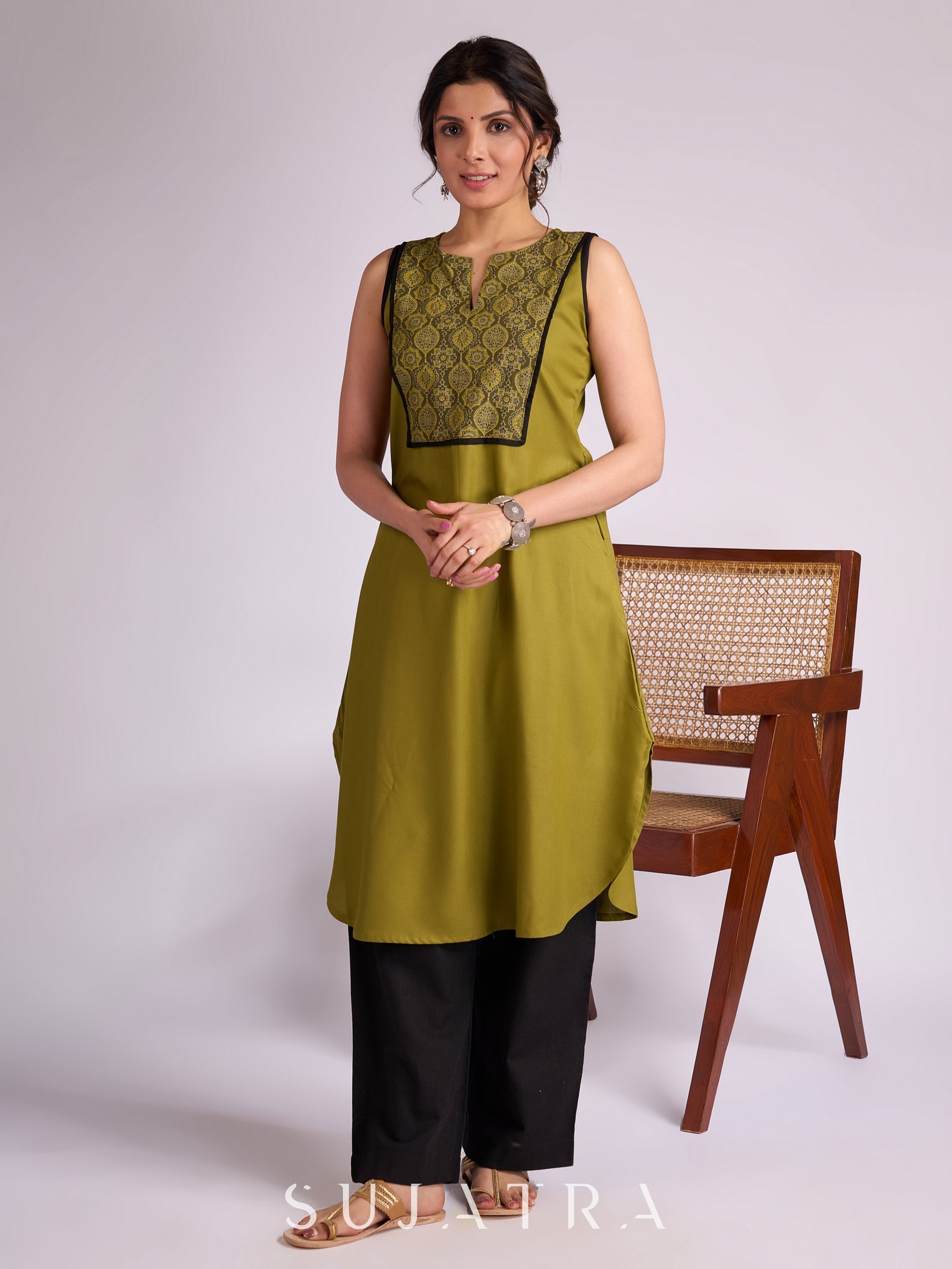 Olive Green Rayon Kurta with Elegant Ajrakh Yoke & Black Piping