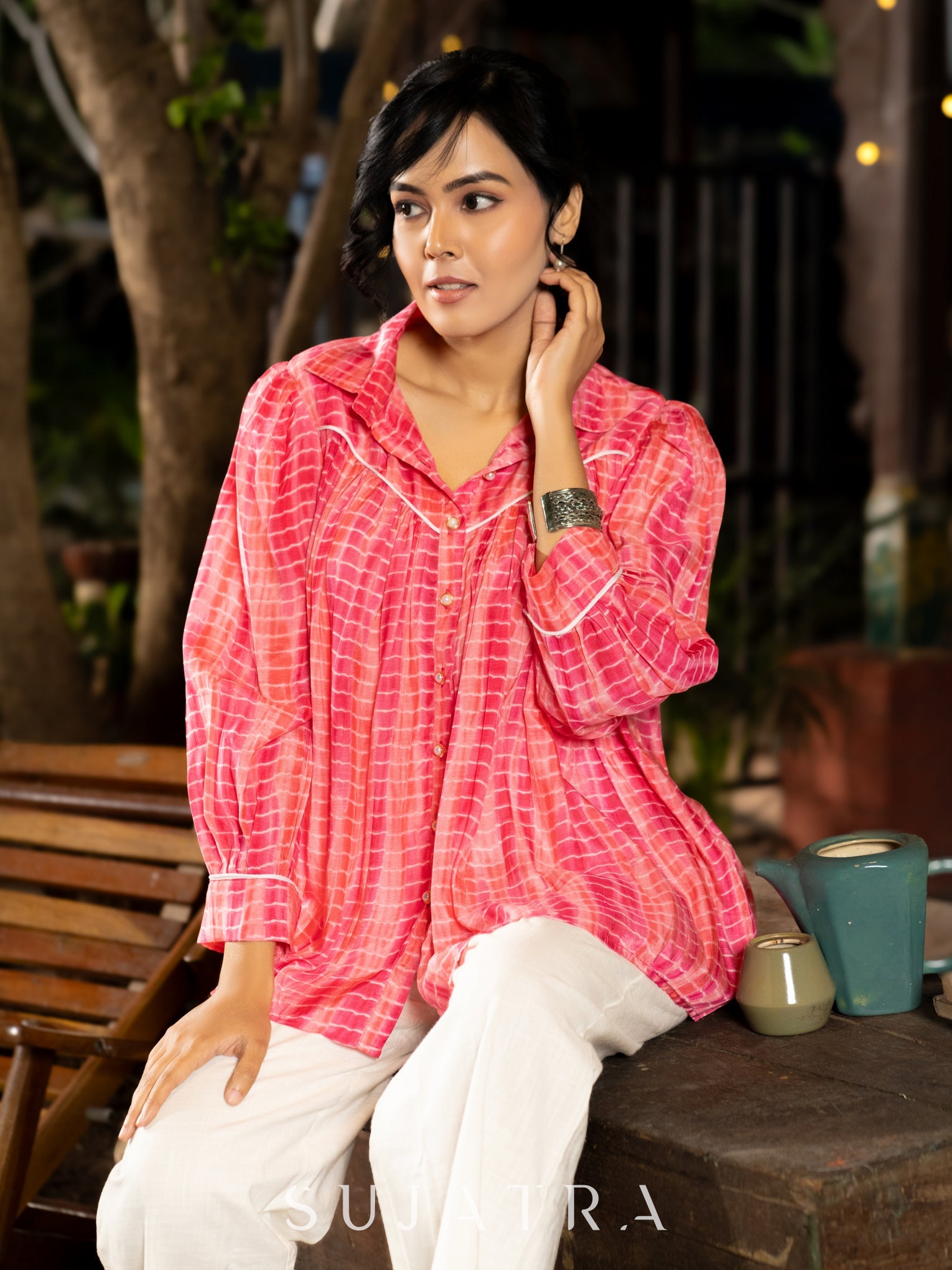 Playful Pink Tie-Dye Viscose Gathered Shirt with Crisp White Piping