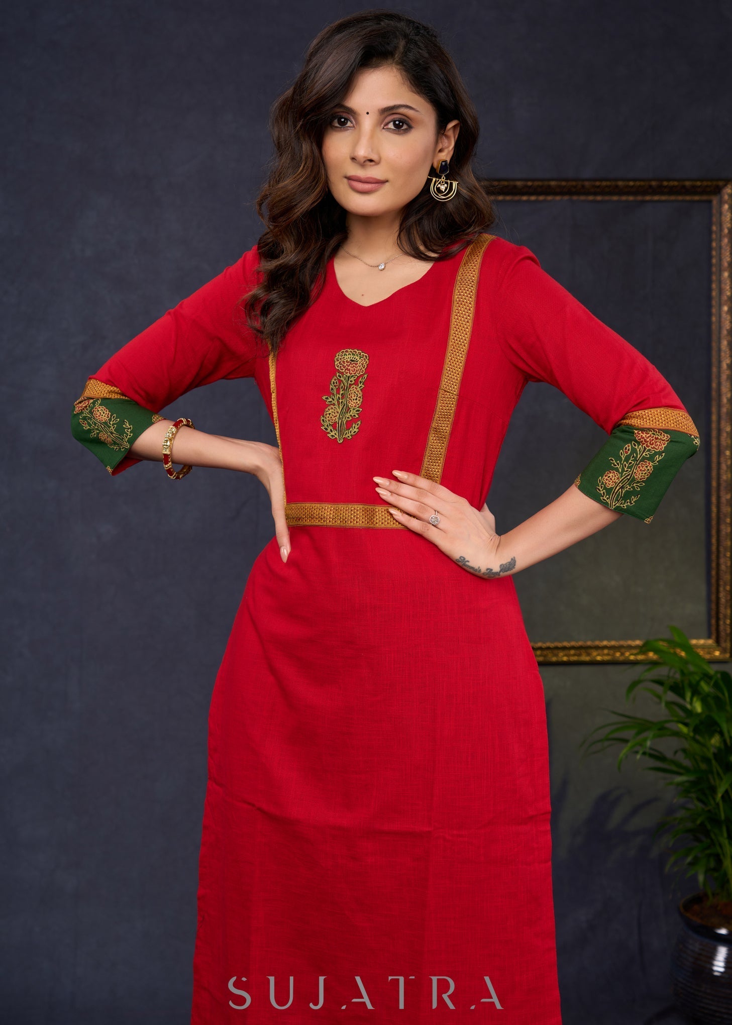Graceful-Red-Cotton-Straight-Cut-Kurta-With-Ajrakh-Combination-Highlighted-With-Floral-Ajrakh-Applique-On-The-Yoke--Pant-Optional