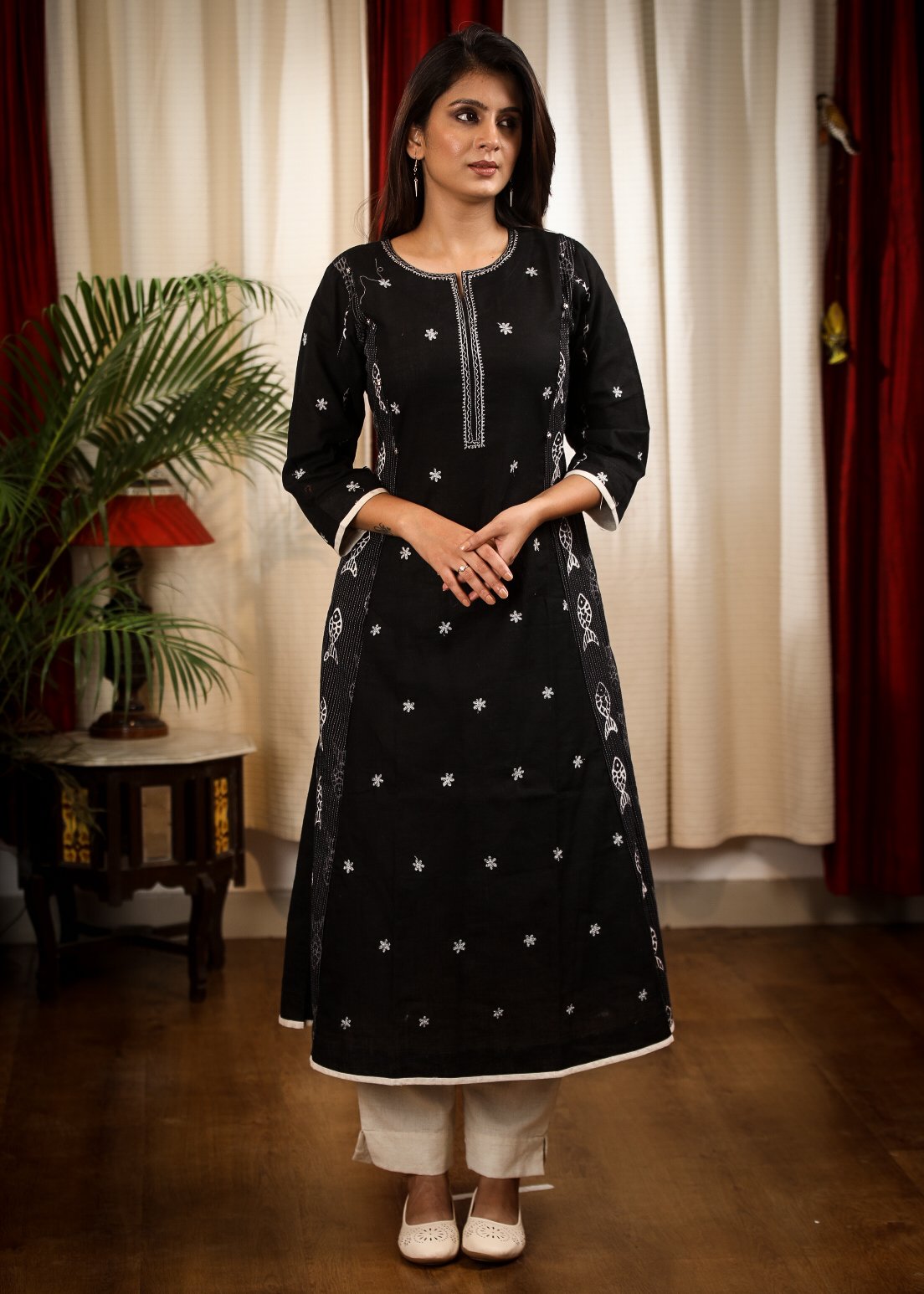 A  - line Black Print Cotton Handloom Combination Kurta With Beautiful Silver Embroidery and Fish Motifs
