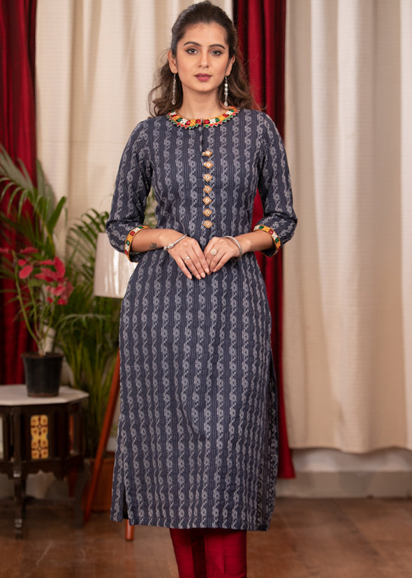 A - Line Blue Cotton Handloom textured Kurta with Hand made kutch Mirror work on the Neck & Sleeves