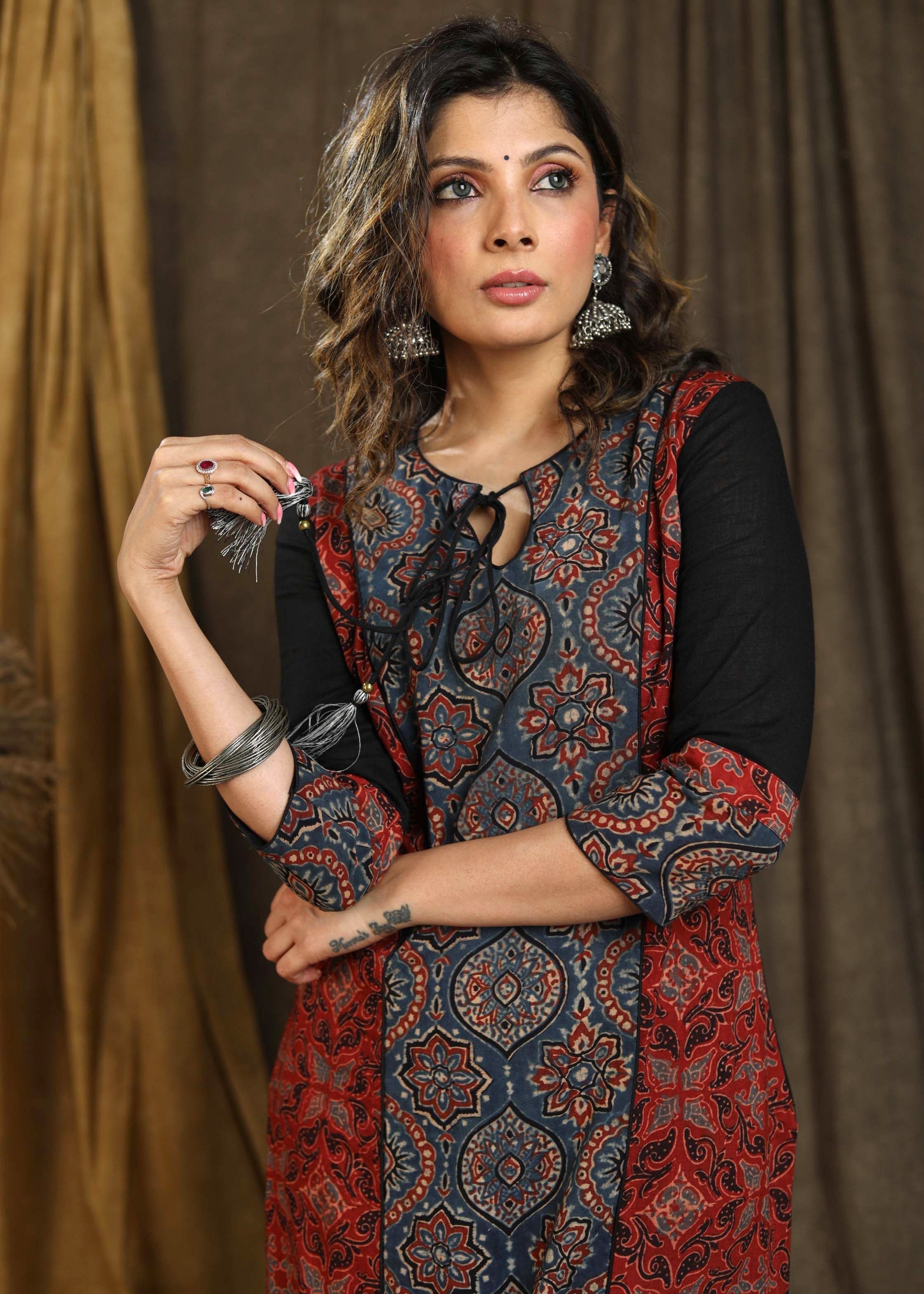 Beautiful Blue Ajrakh Staight Cut kurta with Rust Maroon Panel - Pant Optional