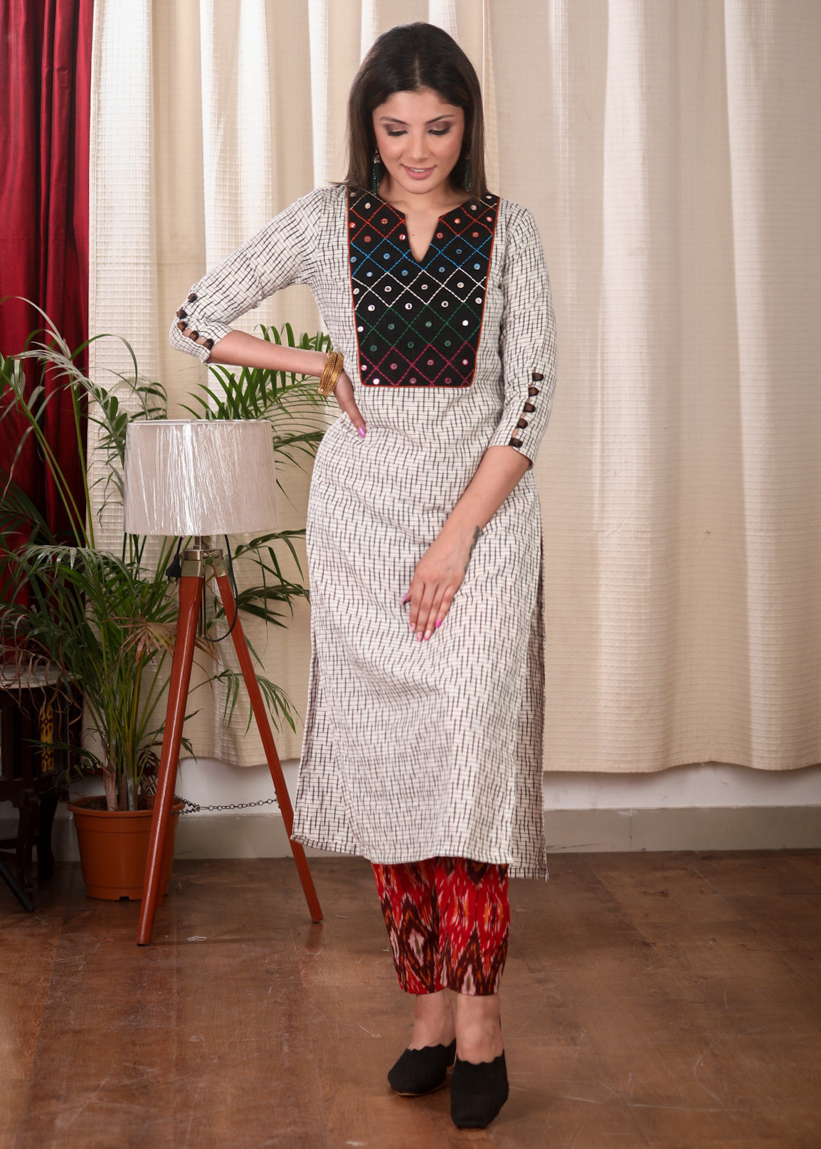 Graceful Straight Cut Ikat Kurta with Hand Embroidered Mirror Work On the Yoke and Beaded Sleeves