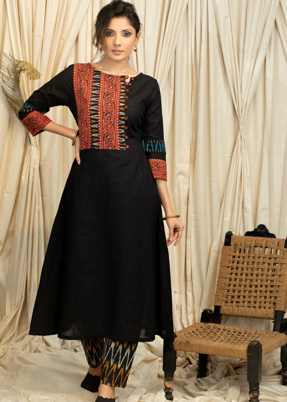 A-Line Cotton Handloom Kurta with Ajrakh and Ikat Combination Yoke