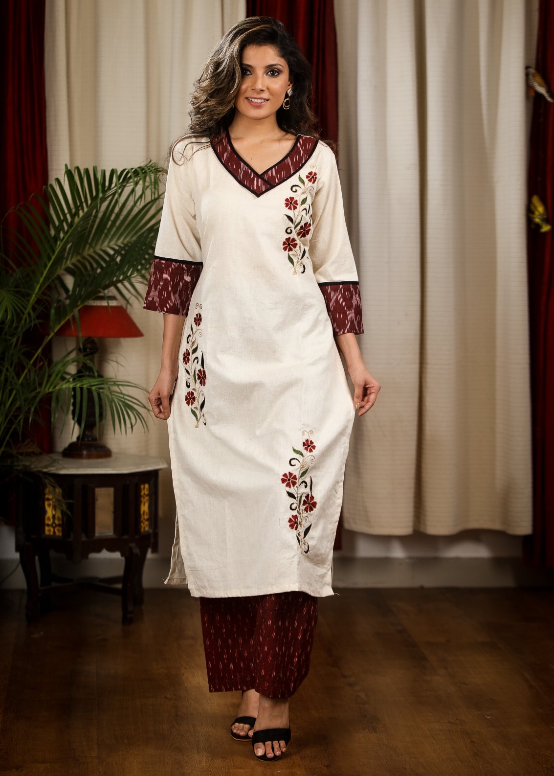 Straight Cut Cotton Handloom Kurta with Elegant Embroidery work and Ikat Details