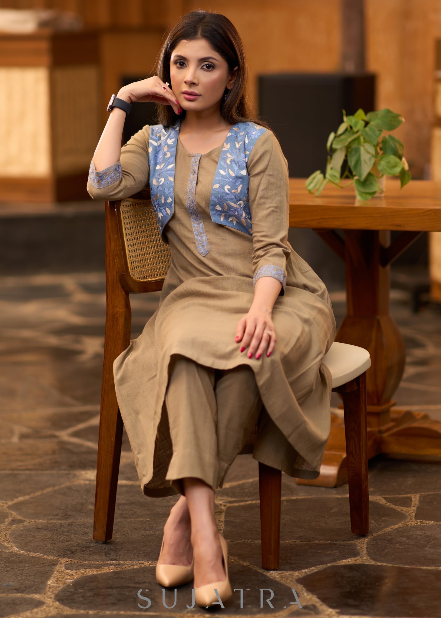 Smart beige cotton kurta with attached embroidered jacket - Pant optional