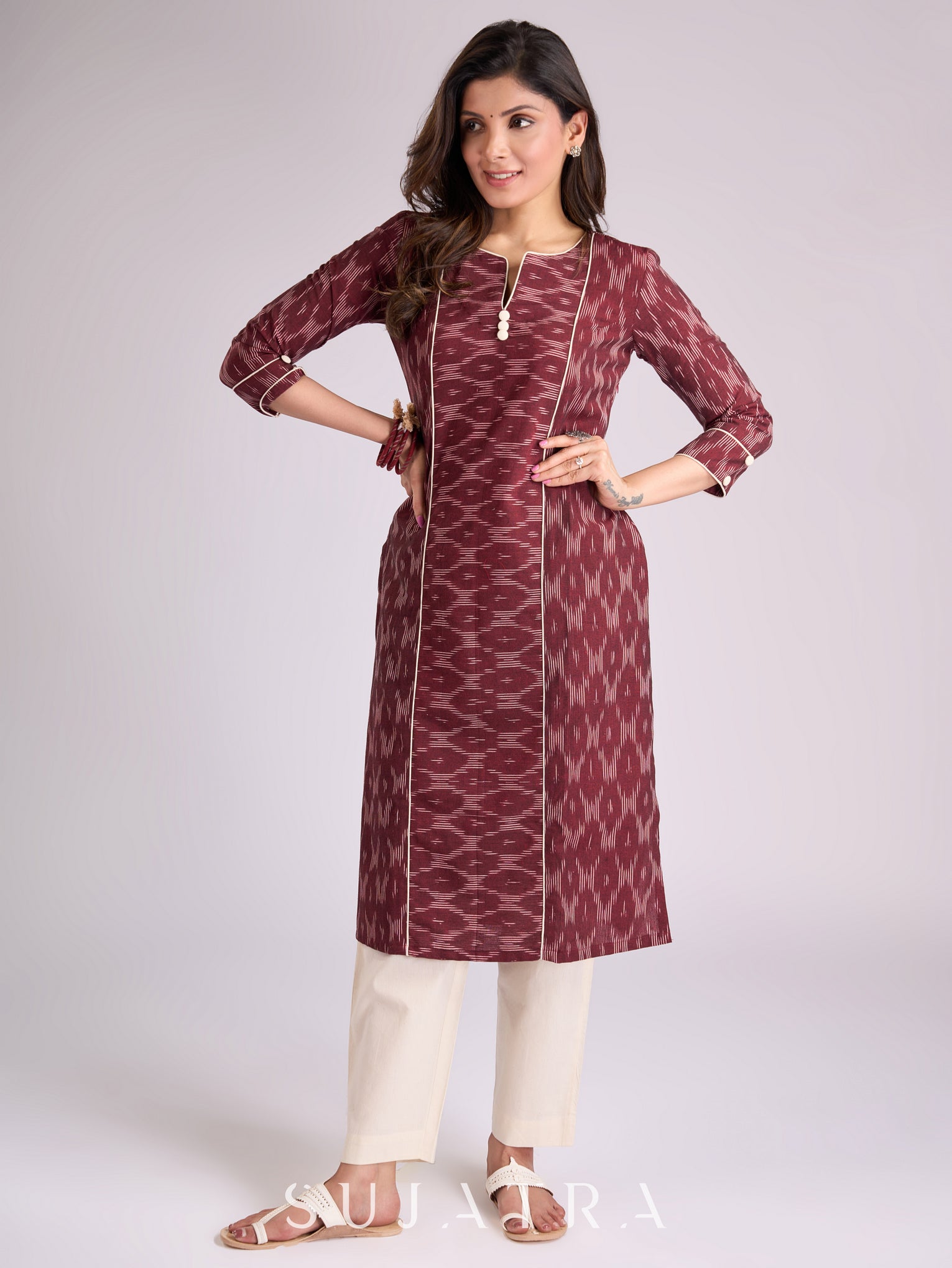 Sophisticated Maroon Ikat Cotton Kurta with Contrasting White Piping Accents