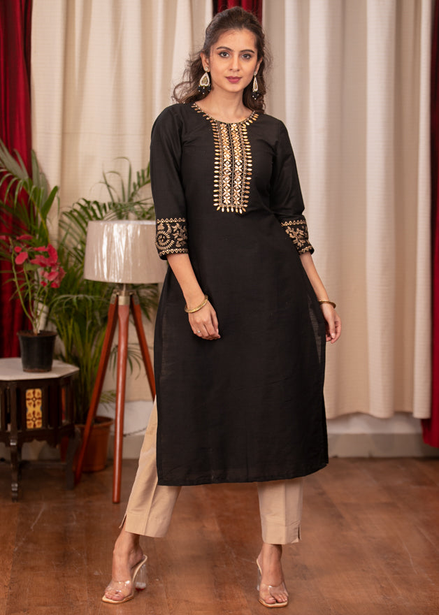 Straight Cut Black Cotton Silk Dress with Handmade Gotta Patti Work and Gold Foiled Warli Work on Sleeves