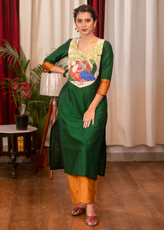 Straight Cut Forest Green Cotton Silk Kurta with Beautiful Gond Painting on the Yoke and Khun Sleeves