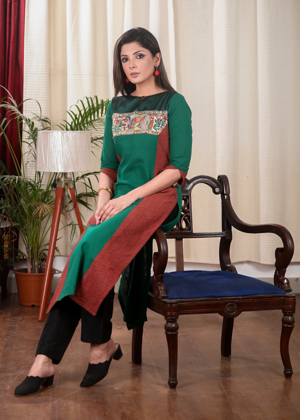Straight Cut Pure Cotton Ajrakh Kurta with exclusive Hand made Madhubani Painting and Khun Fabric On The Yoke