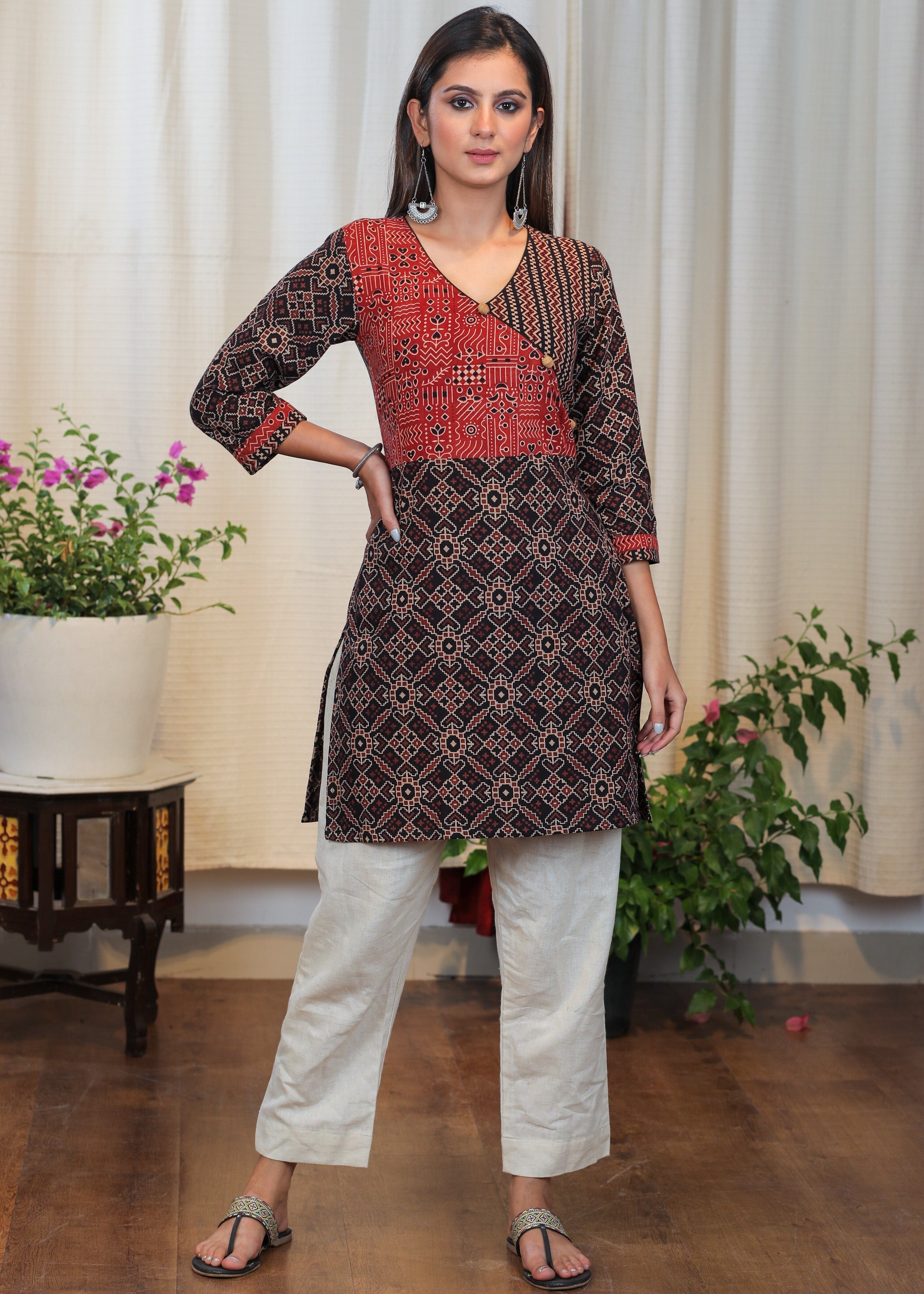 Stylish Cotton Ajrakh Overlapping Tunic with Buttons to Highlight