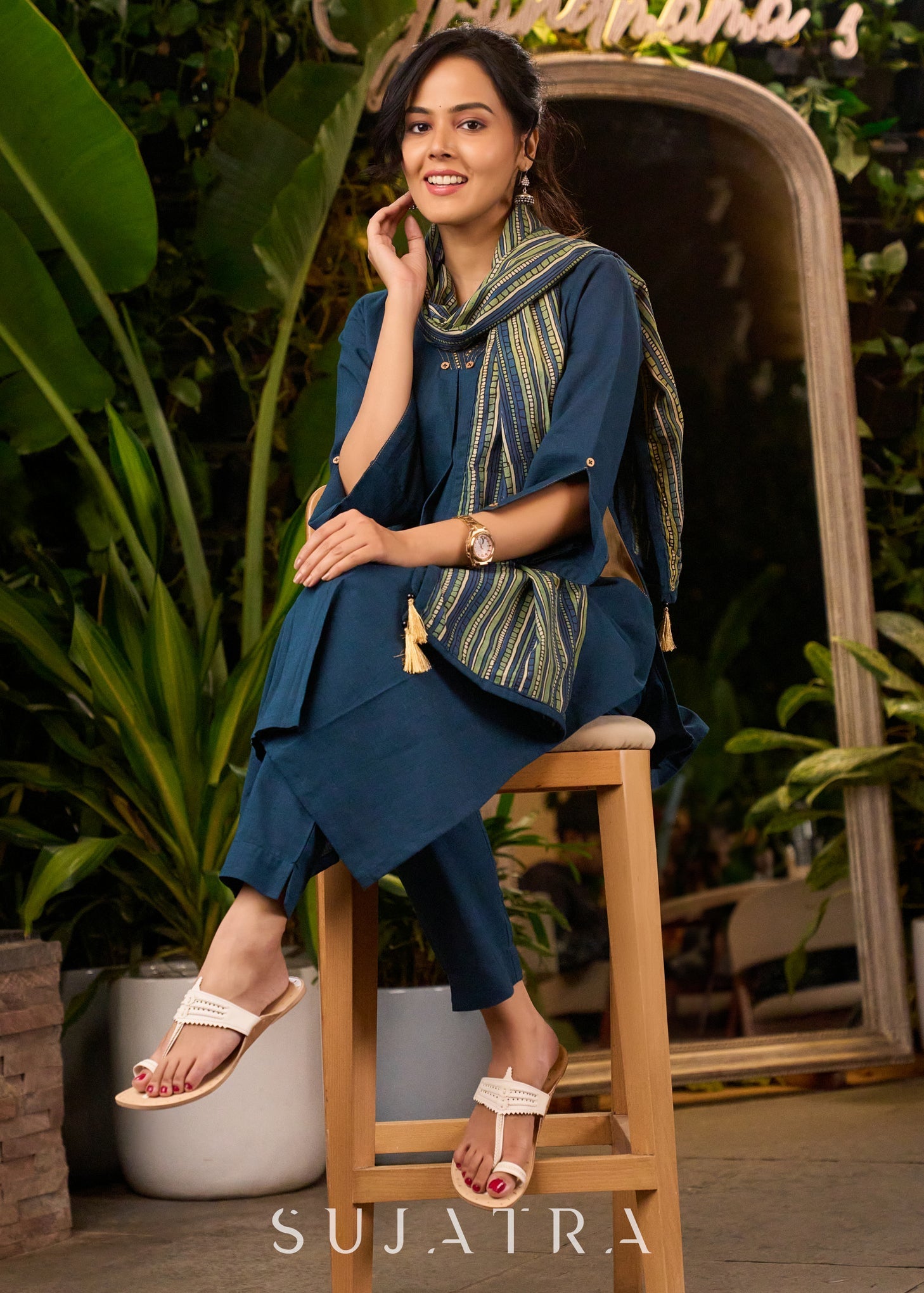 Teal Blue Cotton Kurta with Side Pockets & Hand Painting on Neckline & Pockets with Matching Pants - Stole Optional