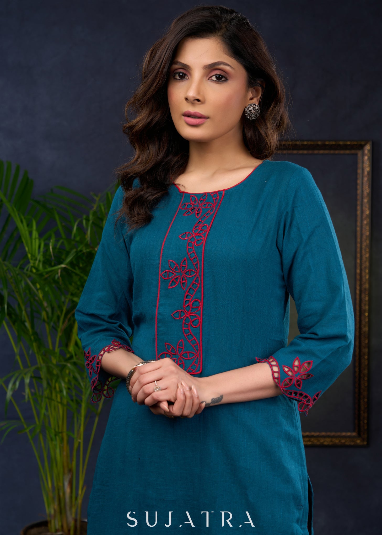 Teal Trendy Tunic With Intricate Cut Work - Pant Optional