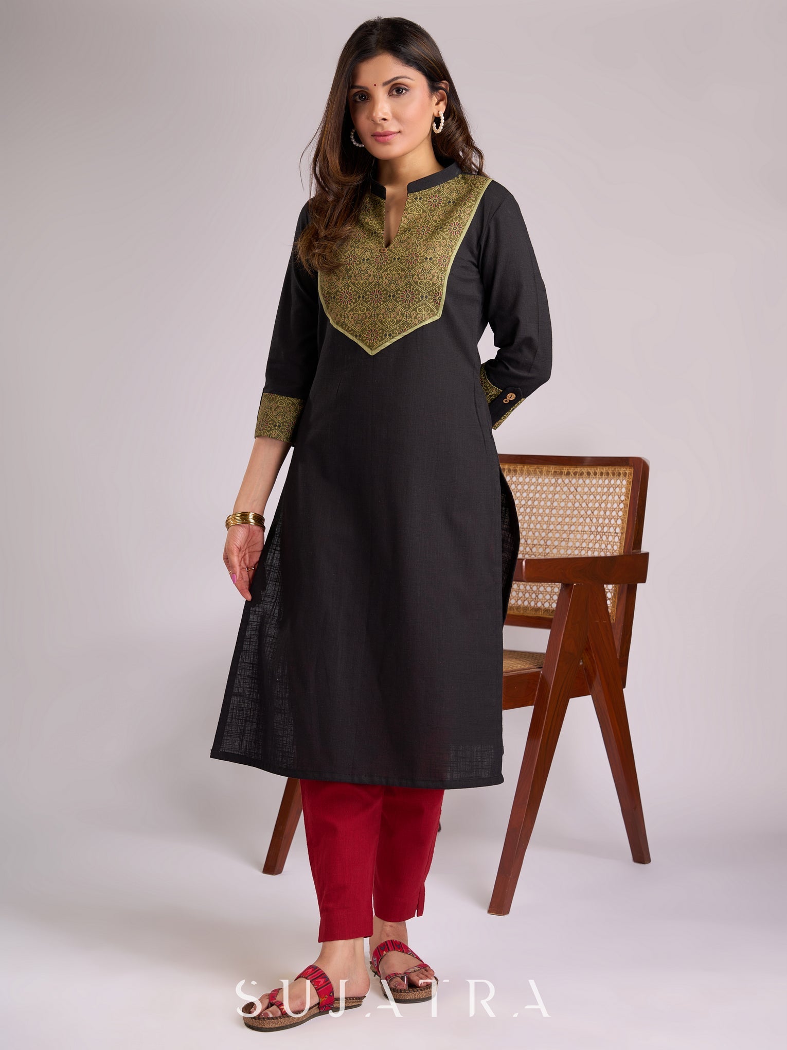 Timeless Black Cotton Kurta with Striking Green Ajrakh Yoke & Cuff Detailing