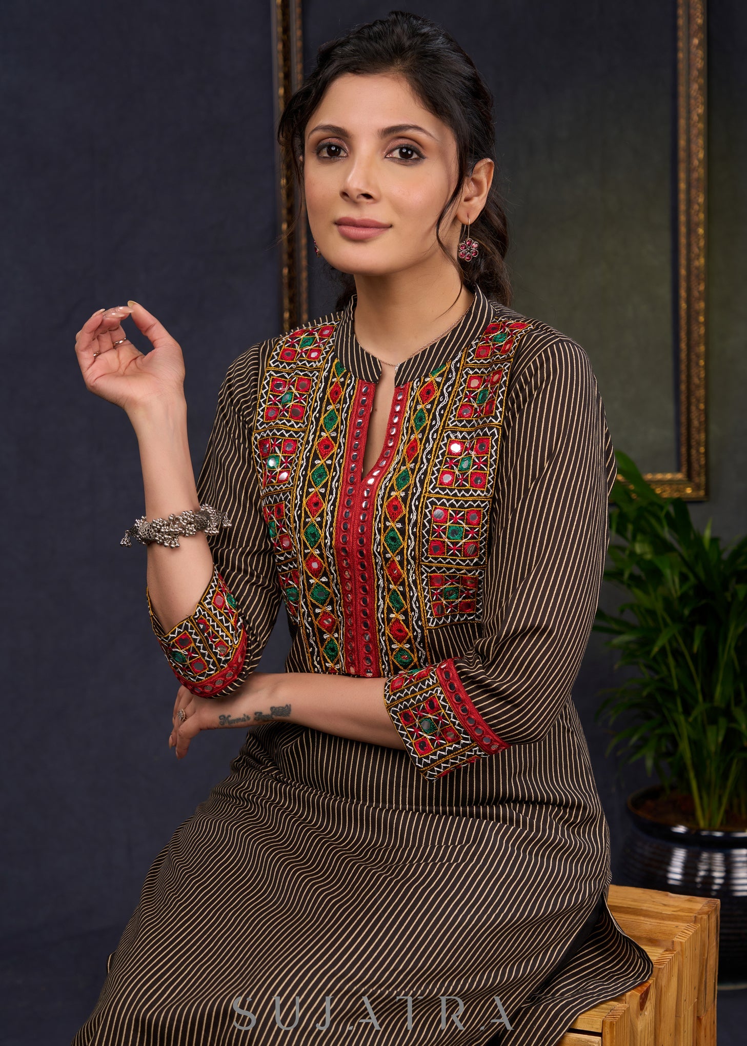 Traditional-Black-Cotton-Ajrakh-Straight-Cut-Kurta-With-Beautiful-Kutch-Mirror-Work--Pant-Optional